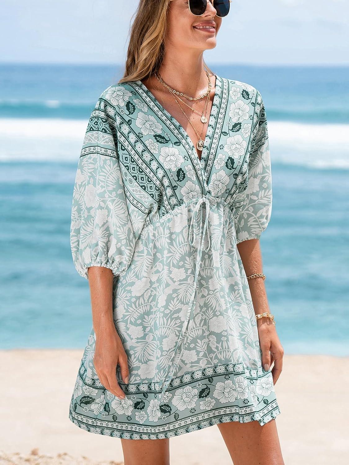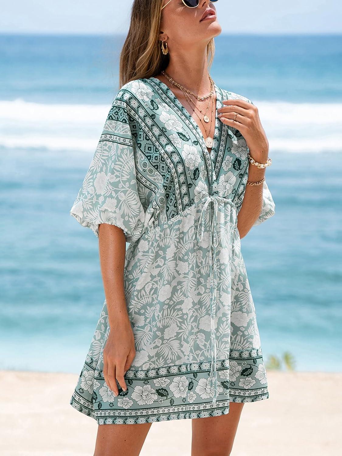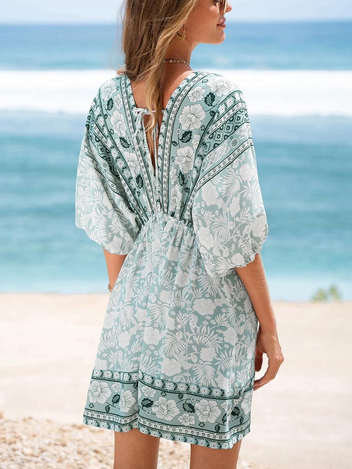 CUPSHE Women's Plunging V Neck Backless Beach Dress Paisley Boho Blouson Sleeve Back Tie Waist Tie Mini Summer Dresses(Green White Floral)