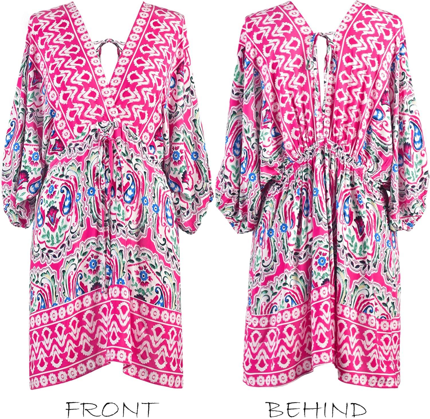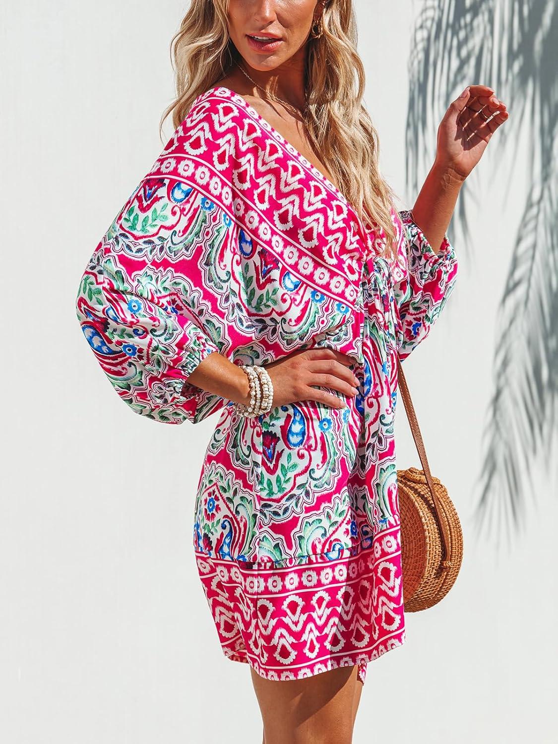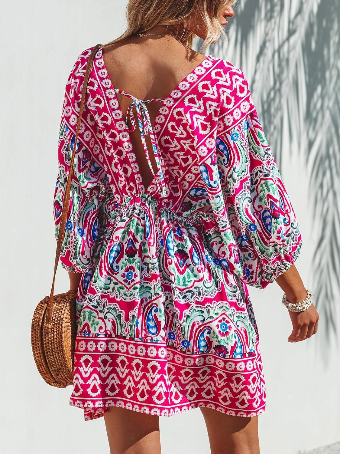 CUPSHE Women’s Plunging V Neck Backless Beach Dress Paisley Boho Blouson Sleeve Back Tie Waist Tie Mini Summer Dresses(Hot Pink)