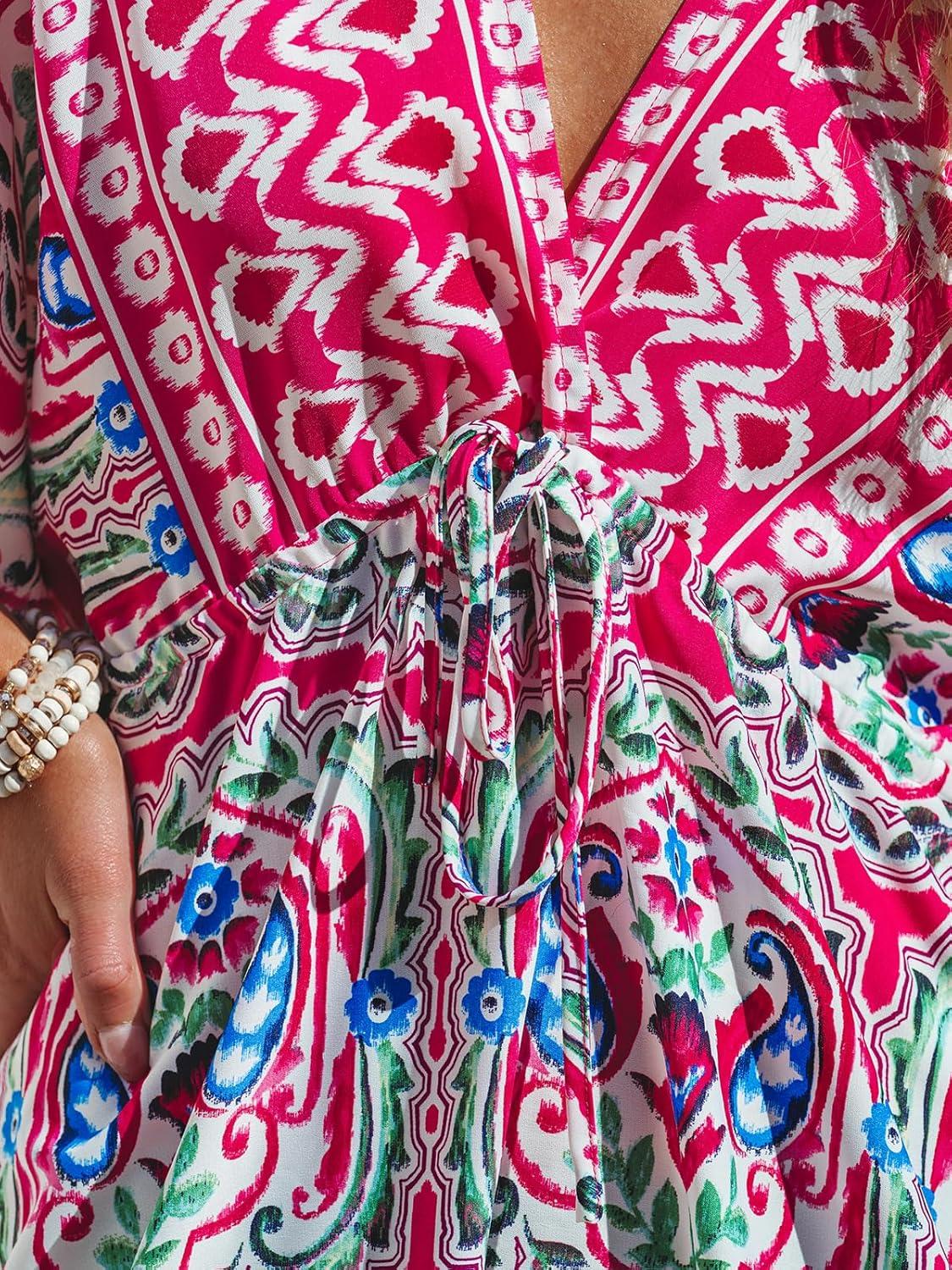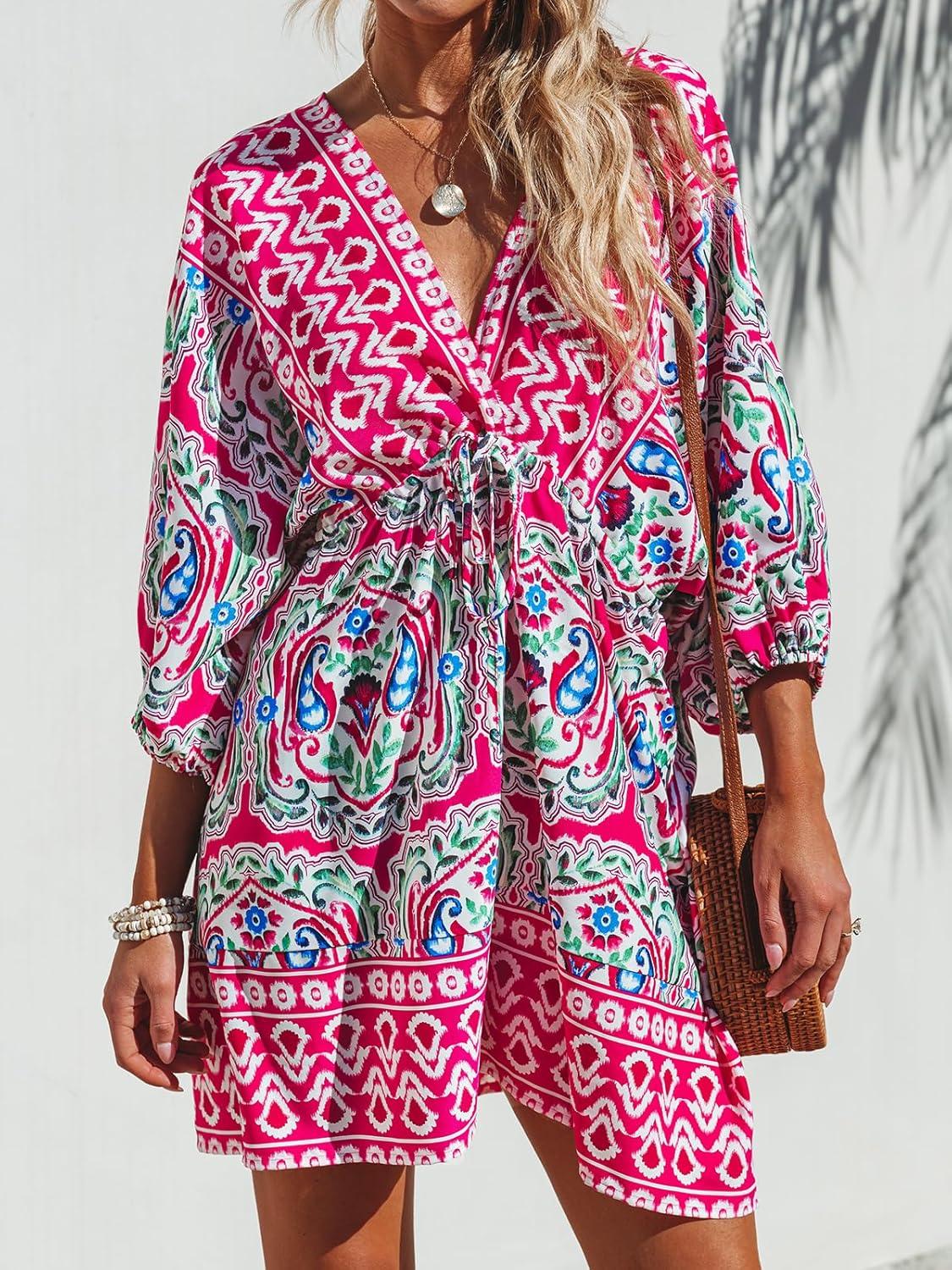 CUPSHE Women's Plunging V Neck Backless Beach Dress Paisley Boho Blouson Sleeve Back Tie Waist Tie Mini Summer Dresses(Hot Pink)