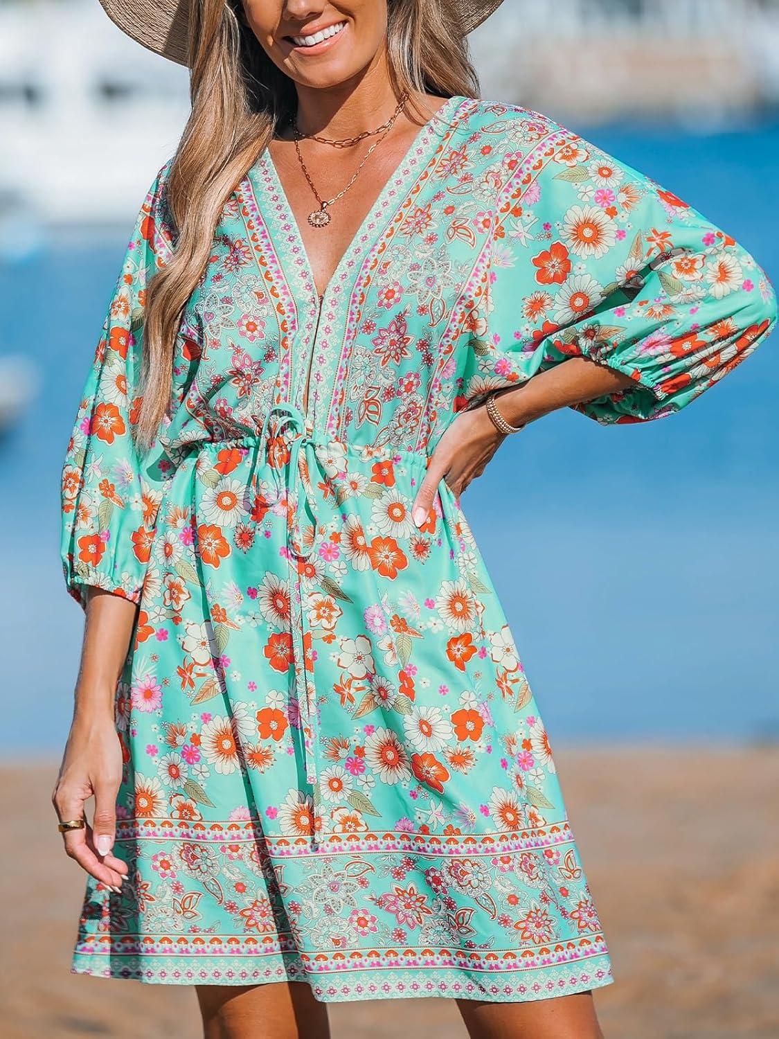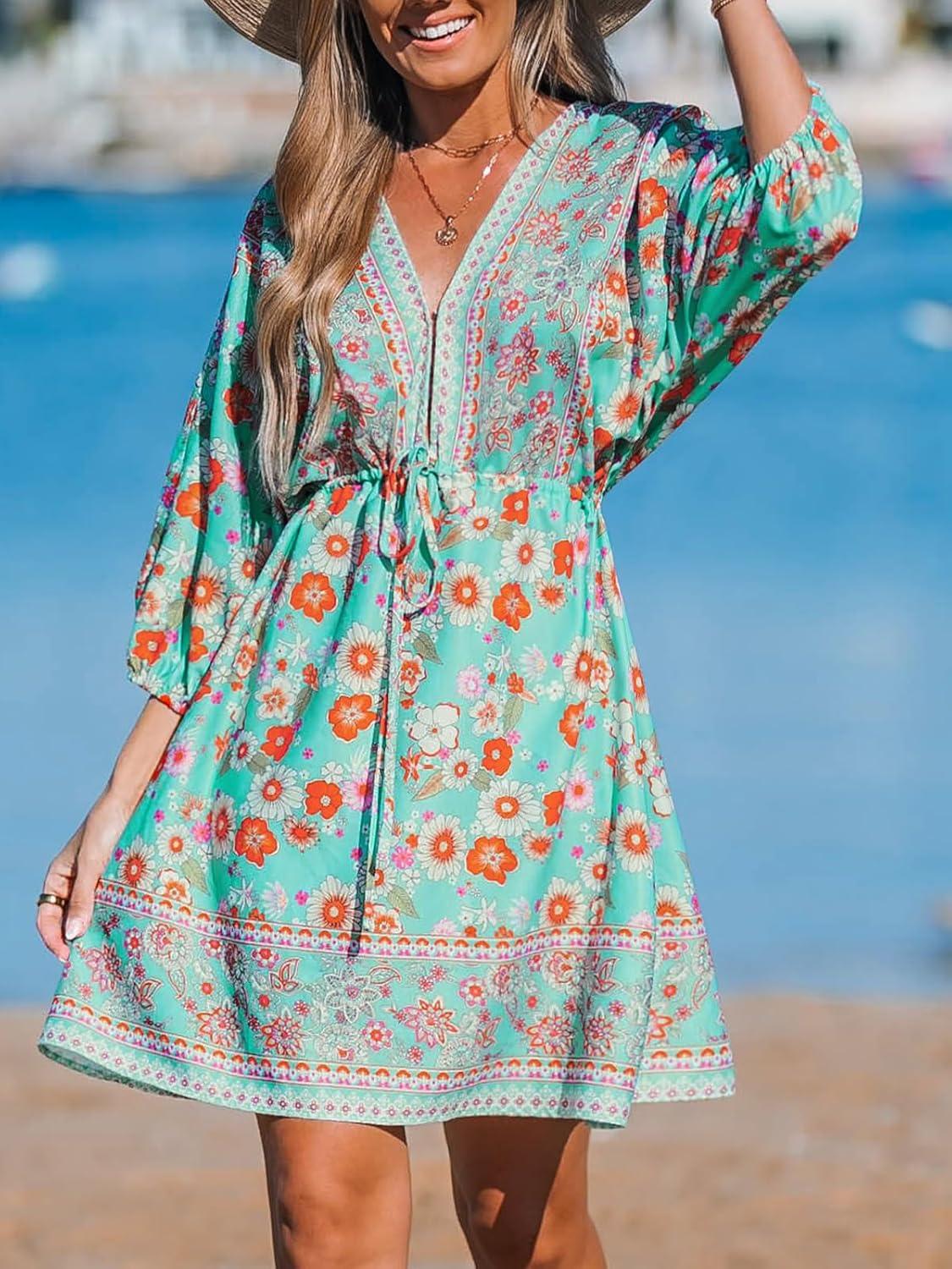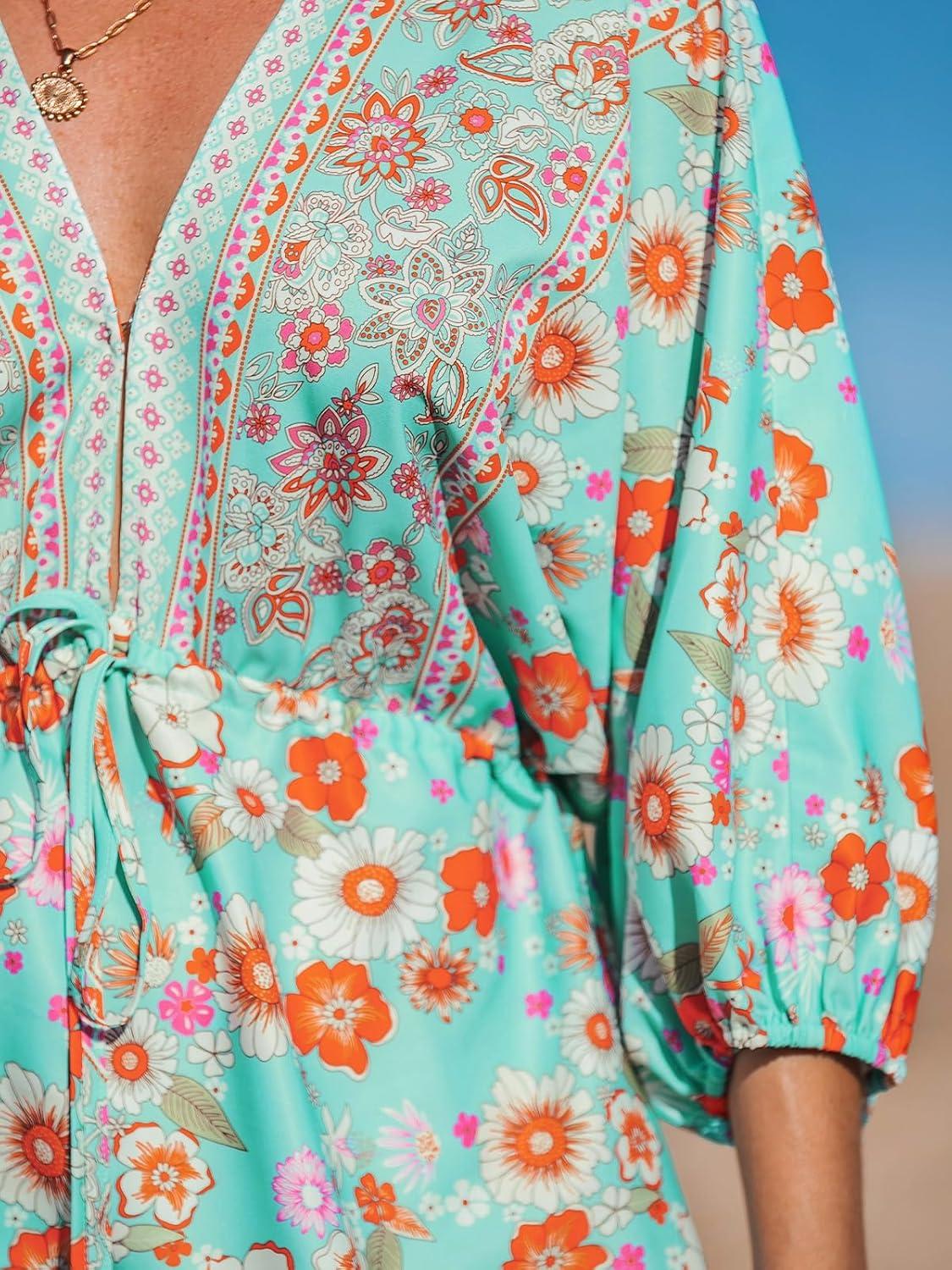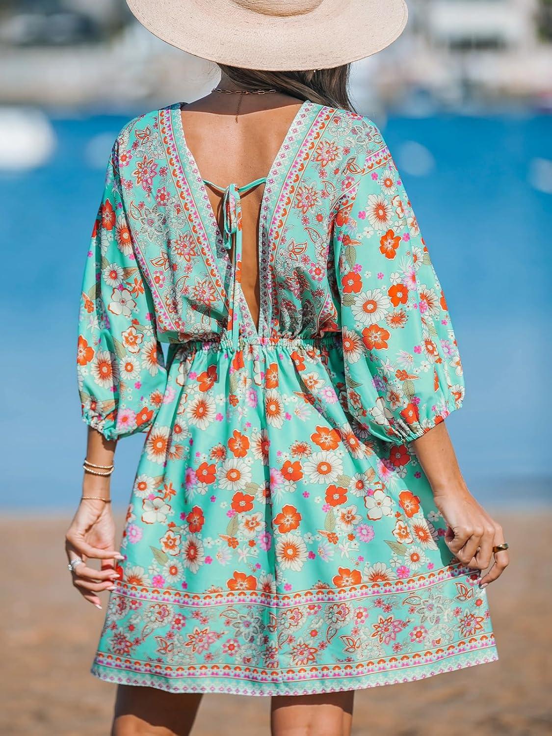 CUPSHE Women's Plunging V Neck Backless Beach Dress Paisley Boho Blouson Sleeve Back Tie Waist Tie Mini Summer Dresses(Teal)