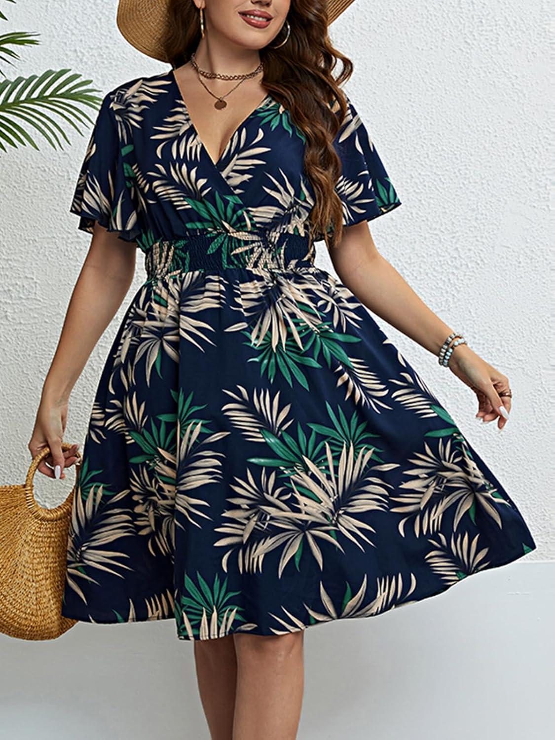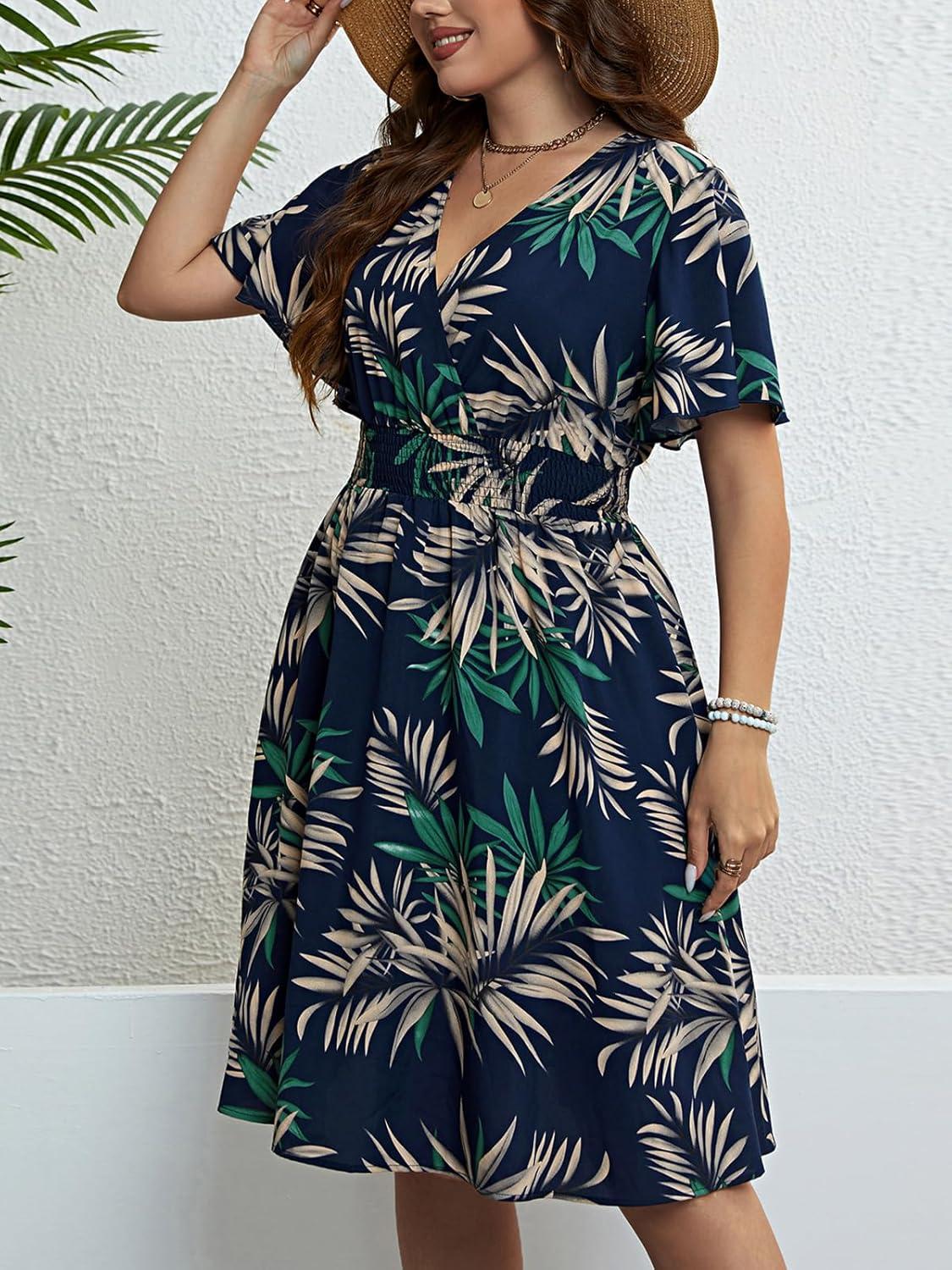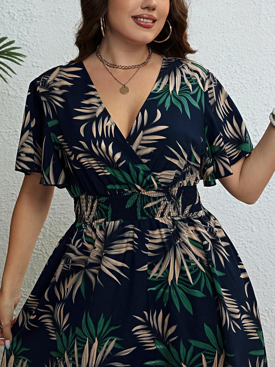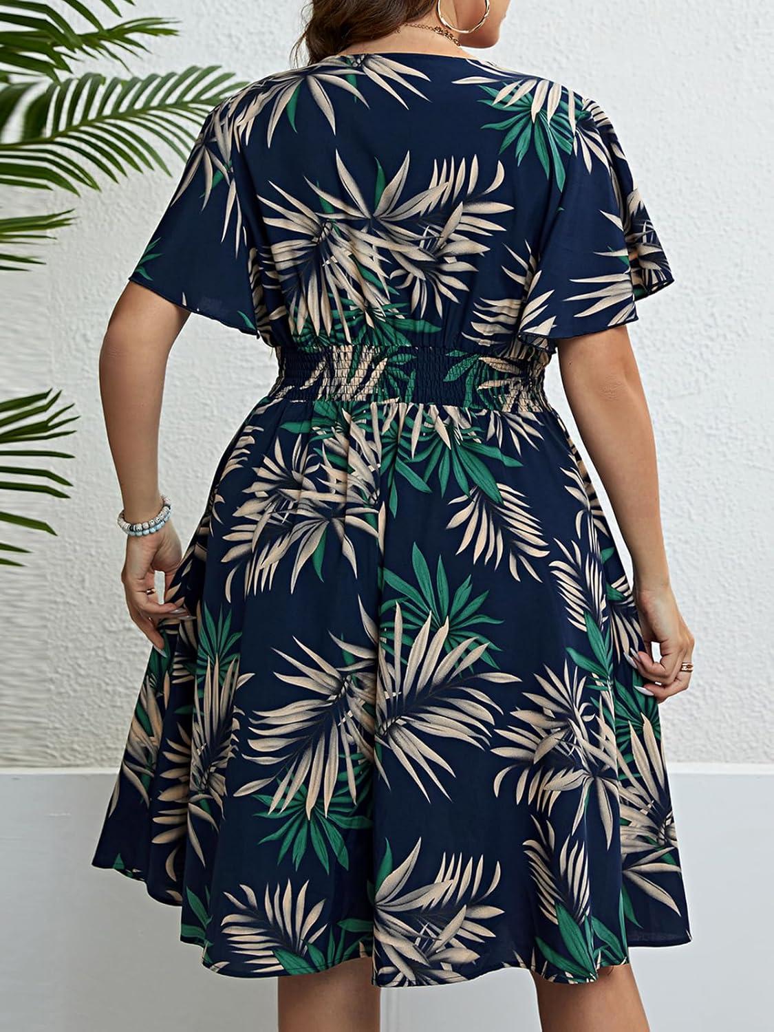 CUPSHE Women’s Plus Size Dress 2024 Summer Midi Dresses Short Sleeve Elastic Waist Bohemian Sundress(Navy/ Tropical)