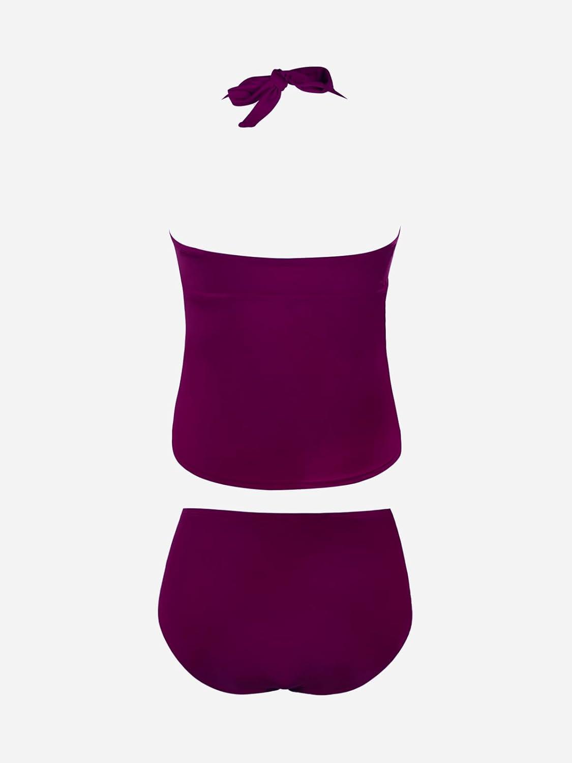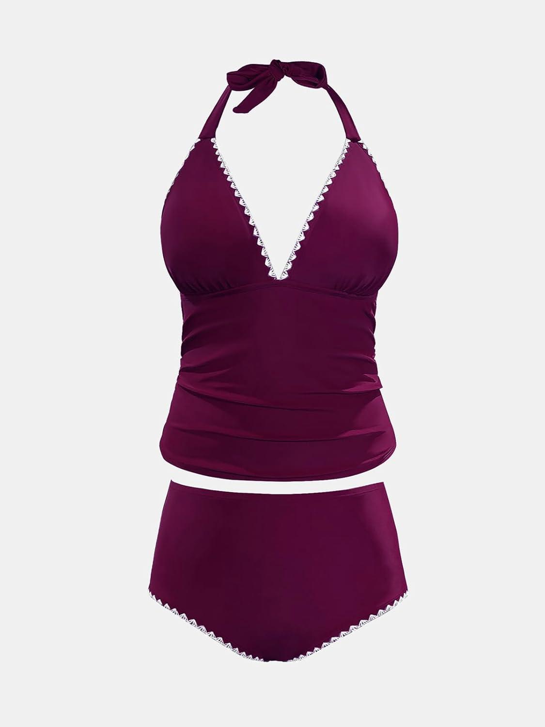 CUPSHE Women’s Plus Size Tankini Sets Halter Strappy Deep V Neck Two Piece Swimsuits Shell Stitched Ruching(Burgundy)