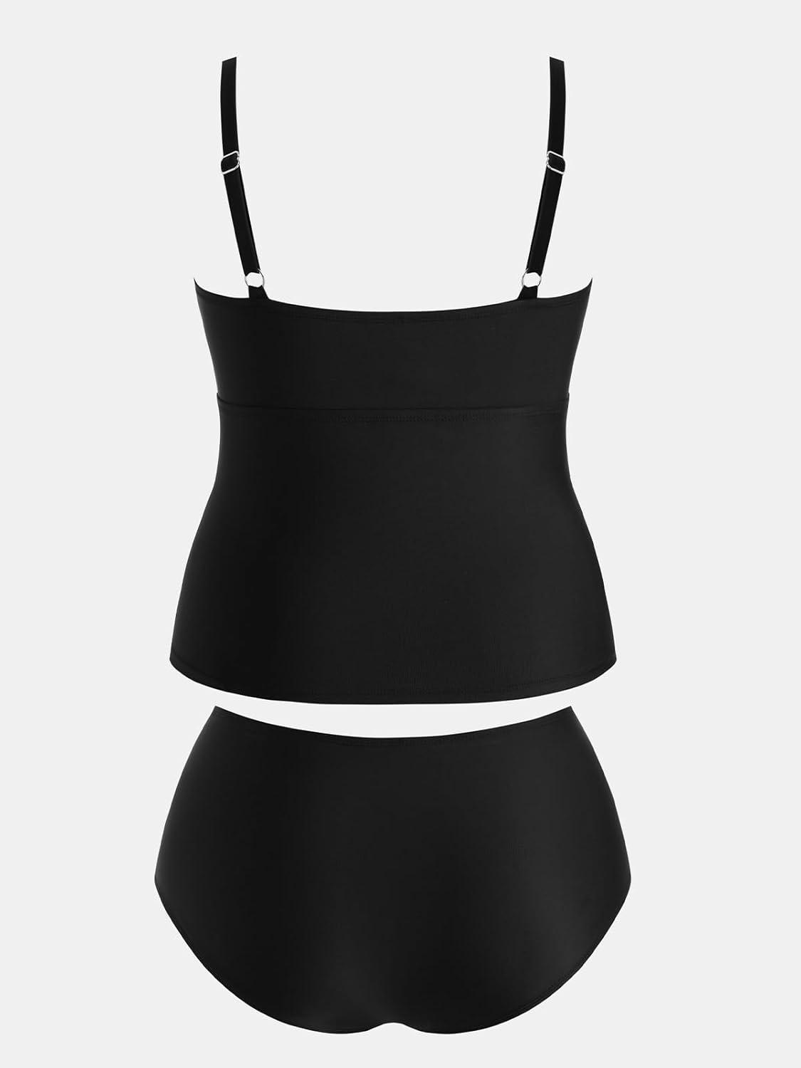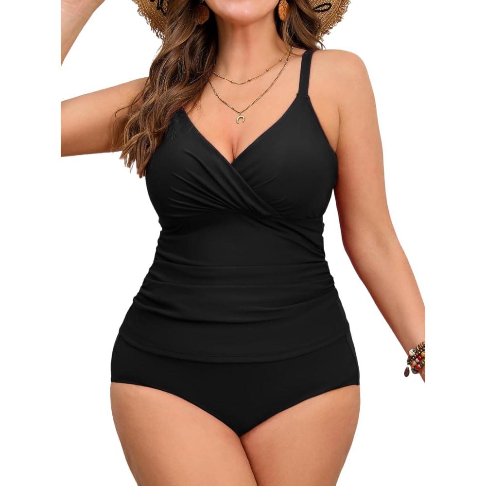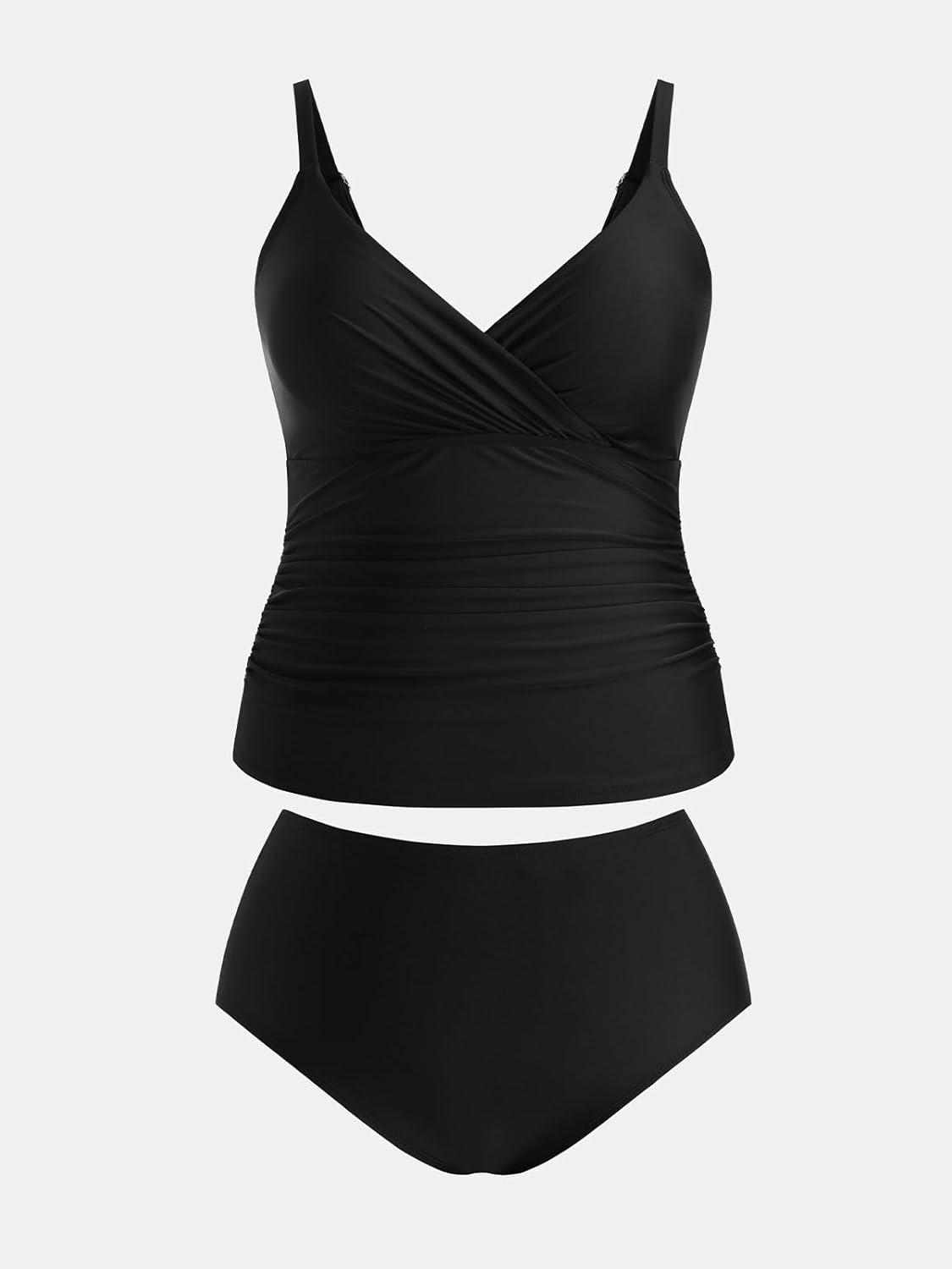 CUPSHE Women's Plus Size Tankini Sets V Neck Ruched Two Piece Swimsuits Adjustable Straps Mid Rise(Black)