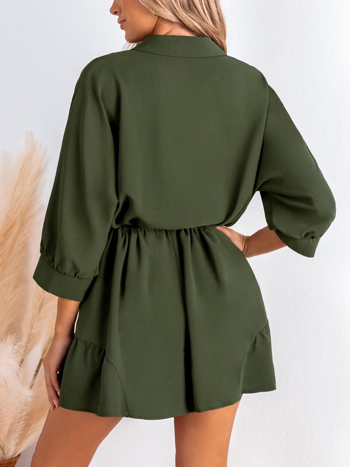 CUPSHE Women’s Romper Collared Button Ruching Lace Up Woven Jumpsuits 3/4 Sleeve Wide Leg Outfit Casual Dressy(Olive)