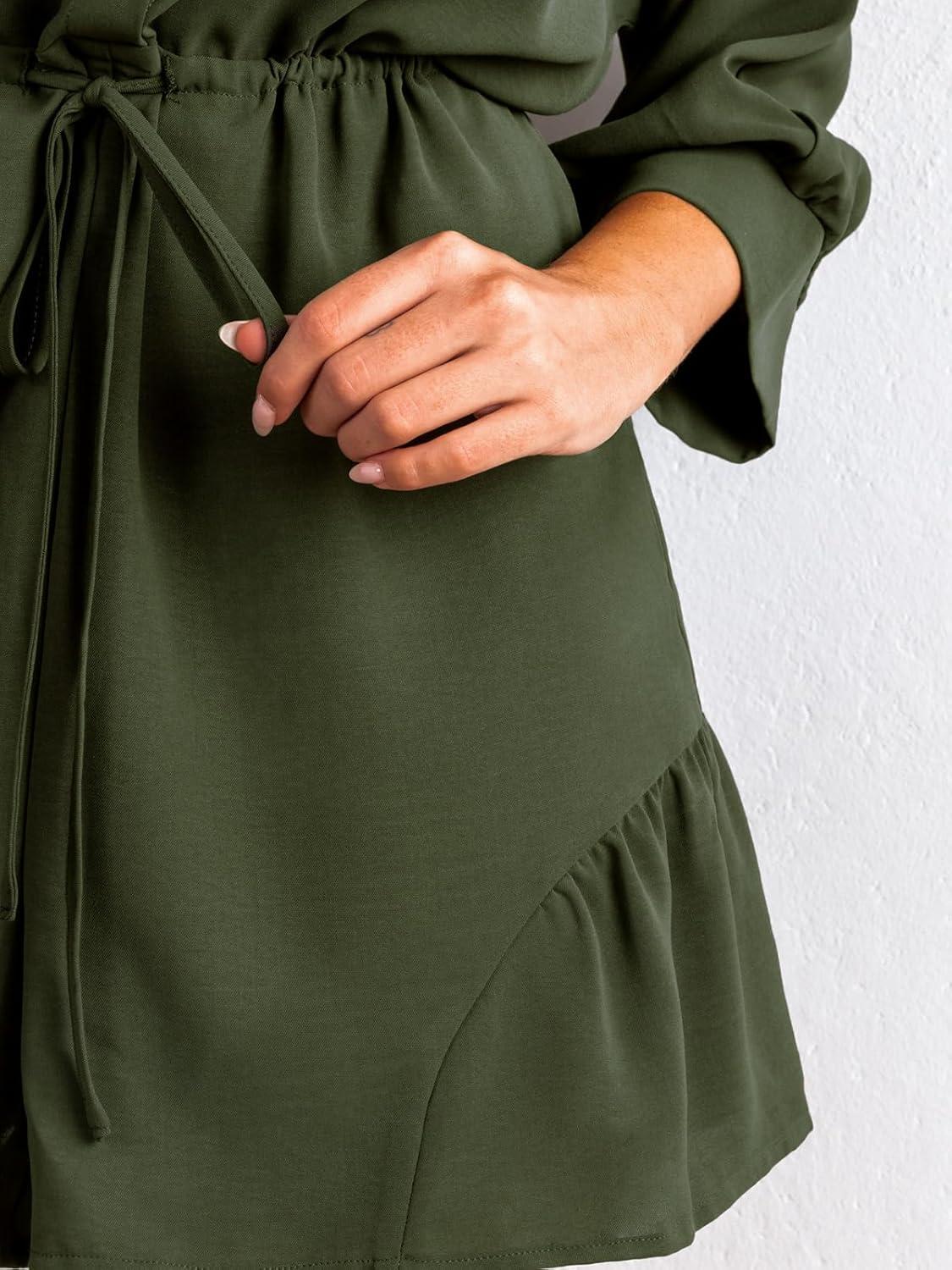 CUPSHE Women's Romper Collared Button Ruching Lace Up Woven Jumpsuits 3/4 Sleeve Wide Leg Outfit Casual Dressy(Olive)