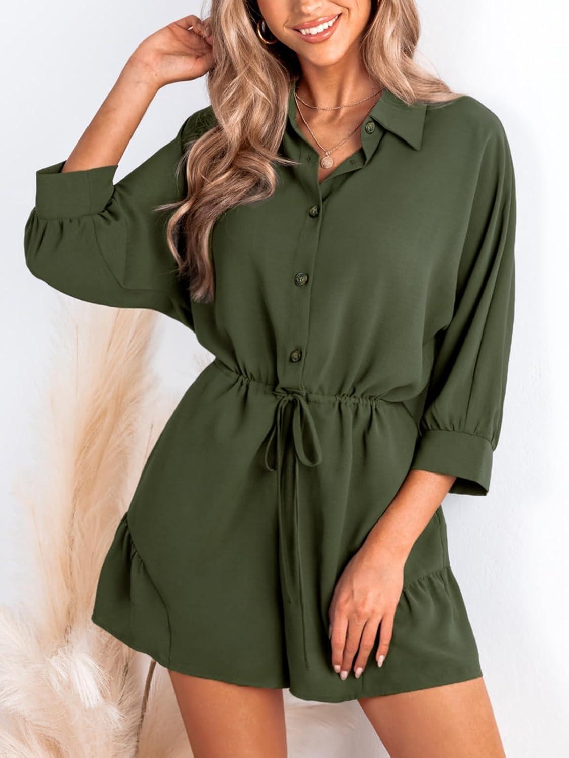 imageCUPSHE Womens Romper Collared Button Ruching Lace Up Woven Jumpsuits 34 Sleeve Wide Leg Outfit Casual DressyOlive