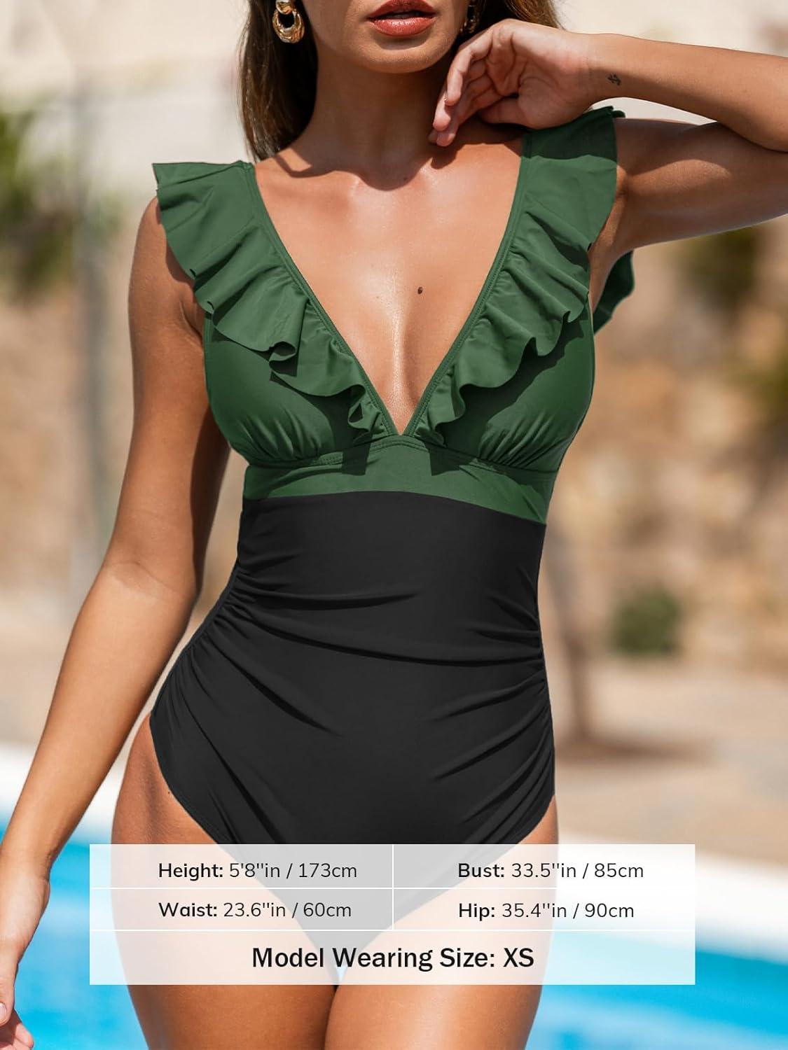 CUPSHE Women’s Ruffled One Piece Swimsuit V Neck Lace Up(Forest Green/Black)