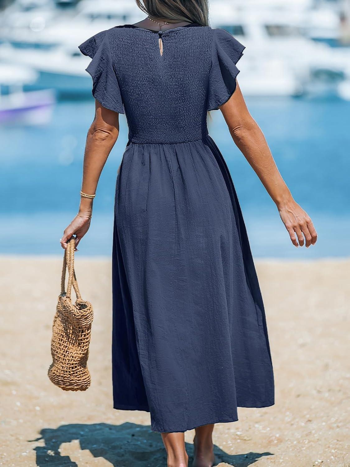 CUPSHE Women's Summer Dress Square Neck Striped Smocked Dress Ruffled Cap Sleeves Dress A Line Maxi Formal Dress(Navy Blue)