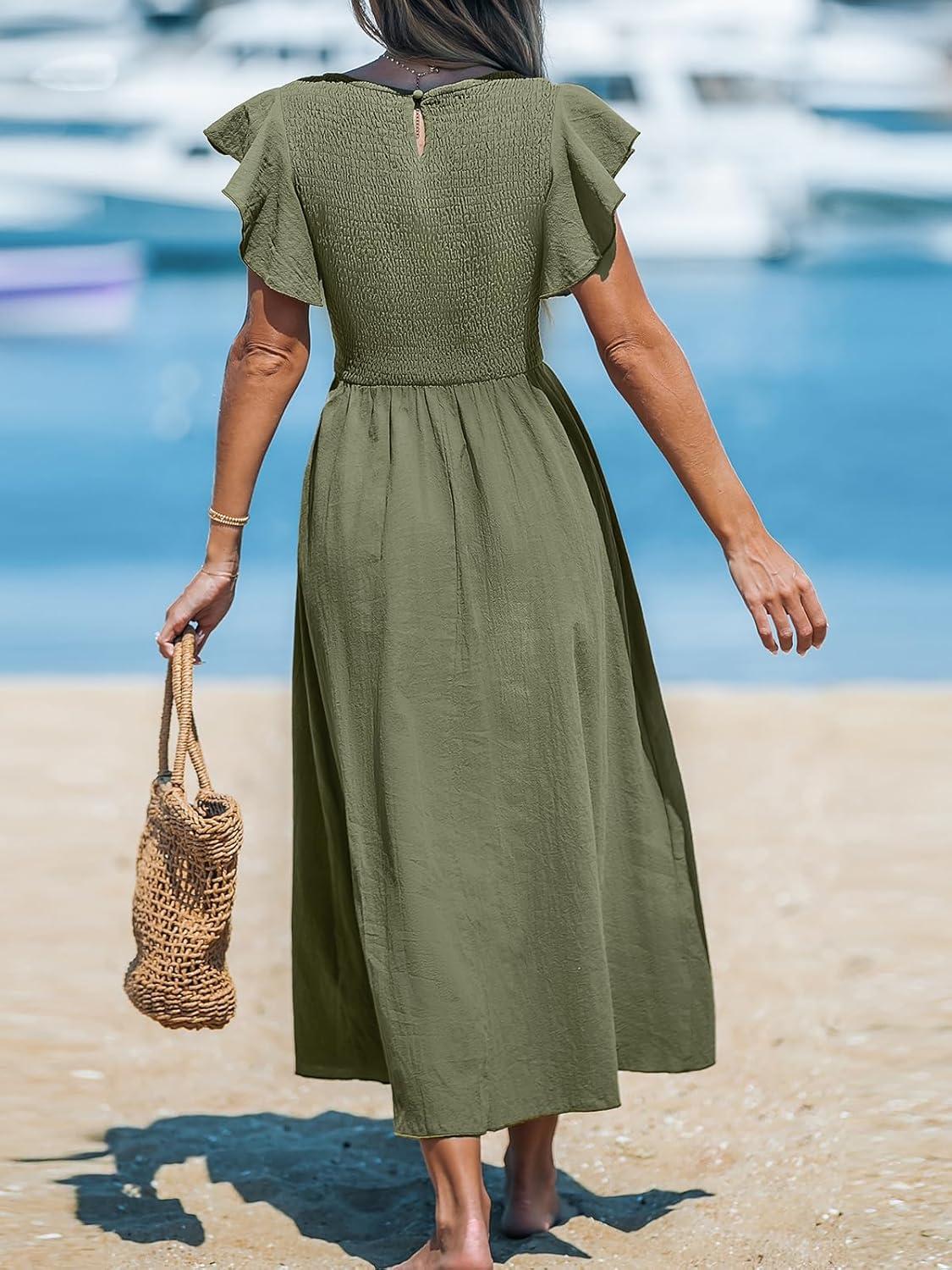 CUPSHE Women’s Summer Dress Square Neck Striped Smocked Dress Ruffled Cap Sleeves Dress A Line Maxi Formal Dress(Olive Green)