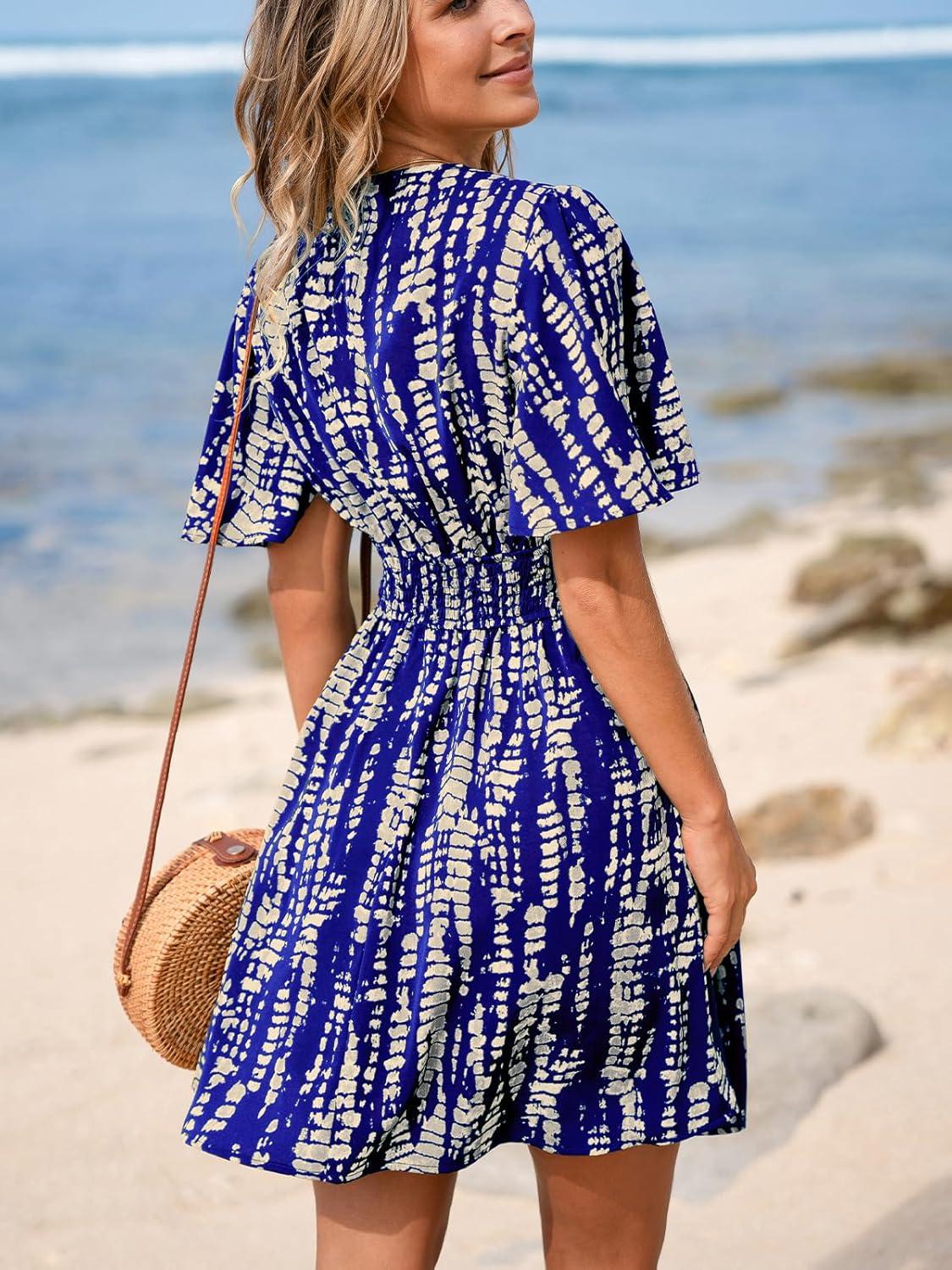 CUPSHE Women's Summer Dresses Abstract Plunging V Neck Short Sleeve Elastic Waist Mini Dress(Blue)