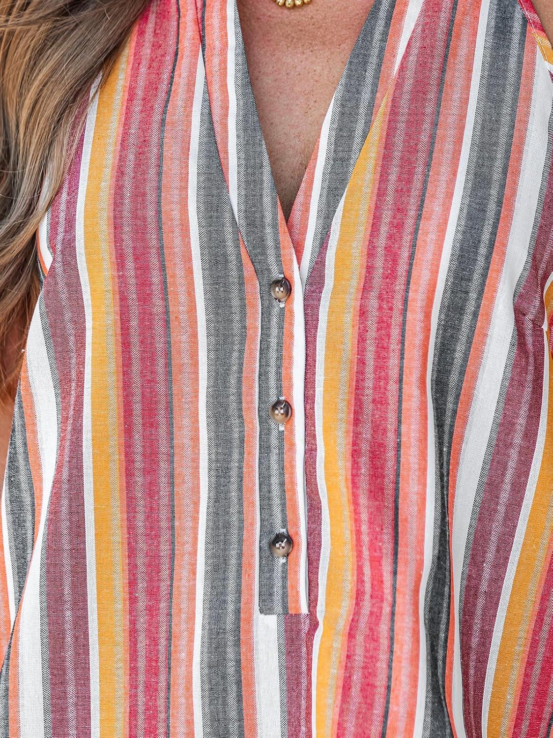 CUPSHE Womens Summer Dresses V Neck Sleeveless Striped Button Up Mini Casual Coverup Dress(Orange Striped)