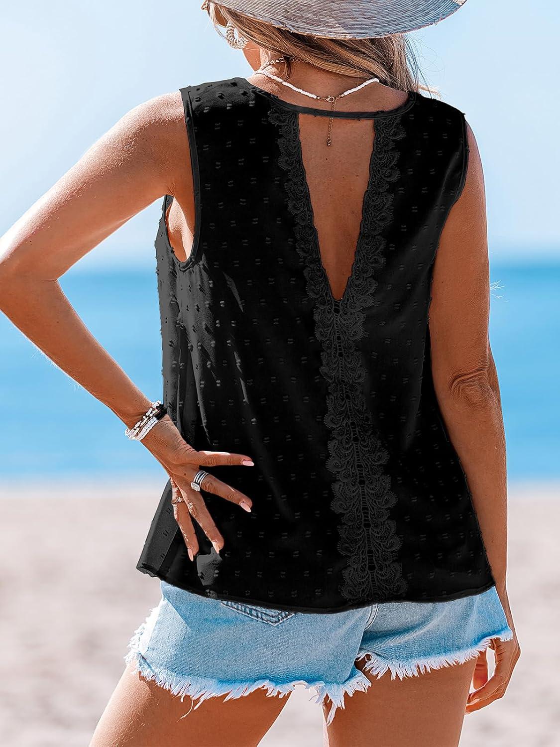 CUPSHE Women's Summer Tank Top Lace V Neck Sleeveless Back Open T Shirts Loose Fit Flowy Blouses Trendy Vacation Outfits(Black)