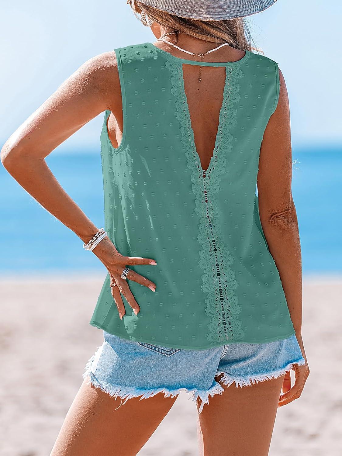 CUPSHE Women's Summer Tank Top Lace V Neck Sleeveless Back Open T Shirts Loose Fit Flowy Blouses Trendy Vacation Outfits(Green)