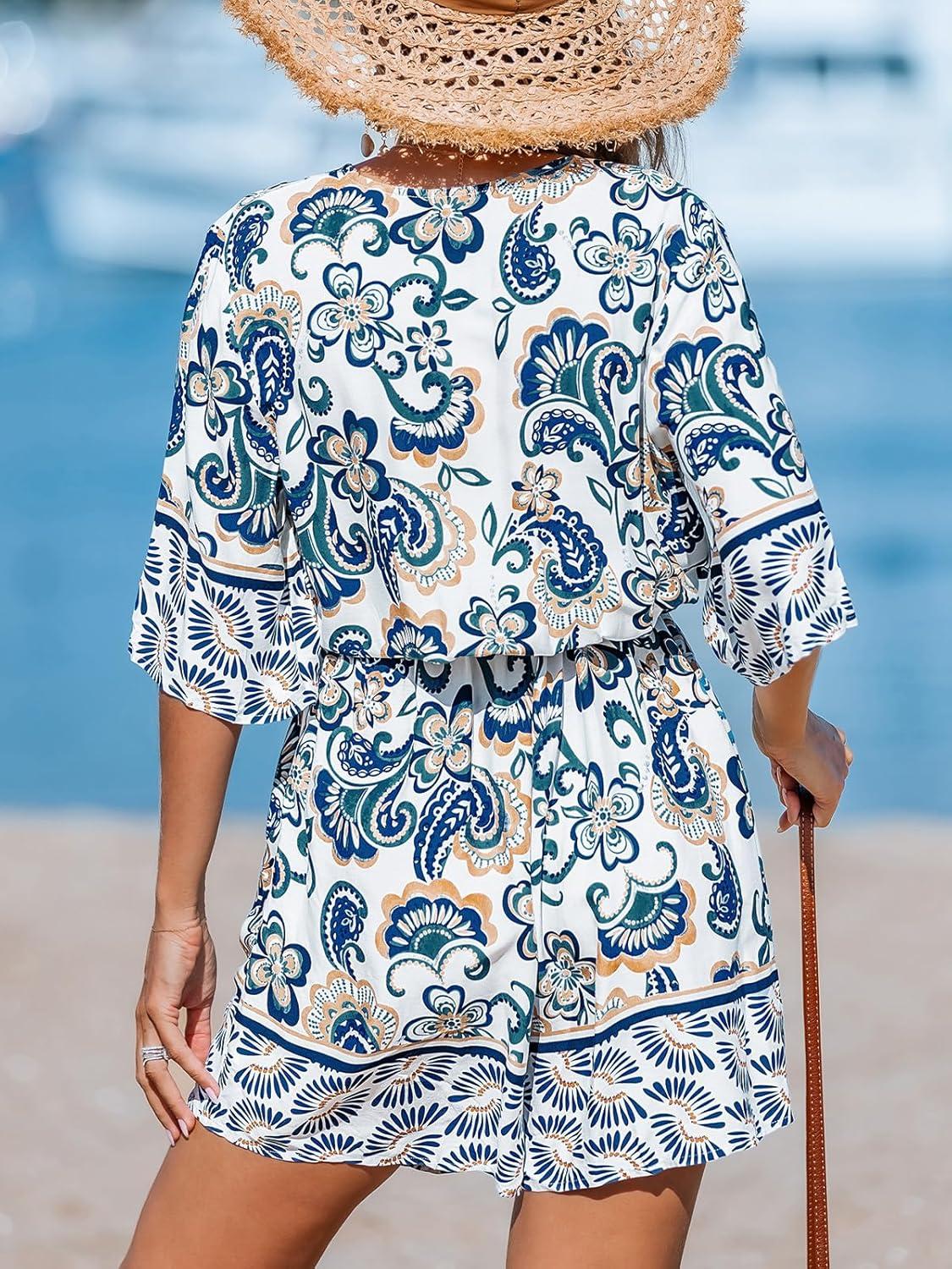 CUPSHE Women’s Summer Wide Leg Rompers V Neck Short Sleeve Overall Jumpsuit Beach Vacation Outfit(Floral Blue)