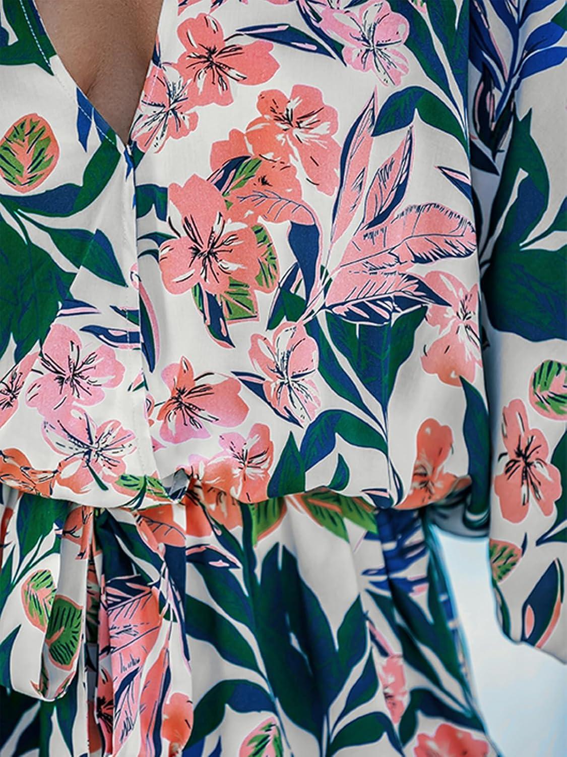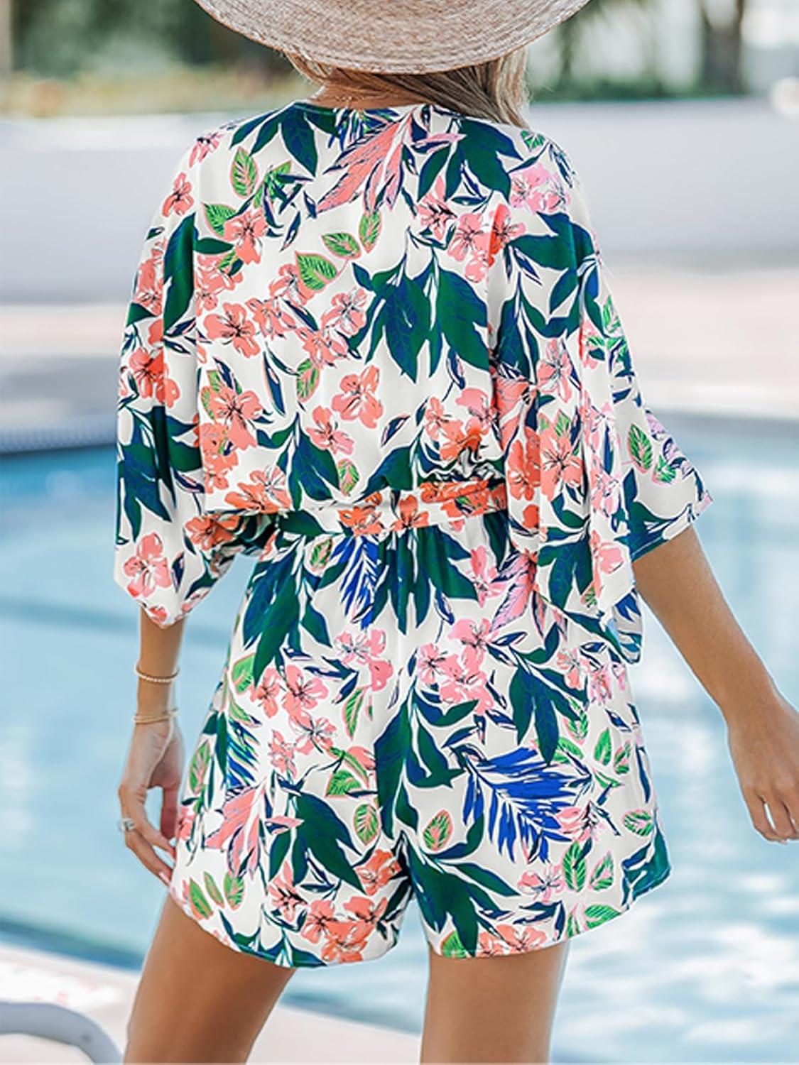 CUPSHE Women's Summer Wide Leg Rompers V Neck Short Sleeve Overall Jumpsuit Beach Vacation Outfit(Floral Green)