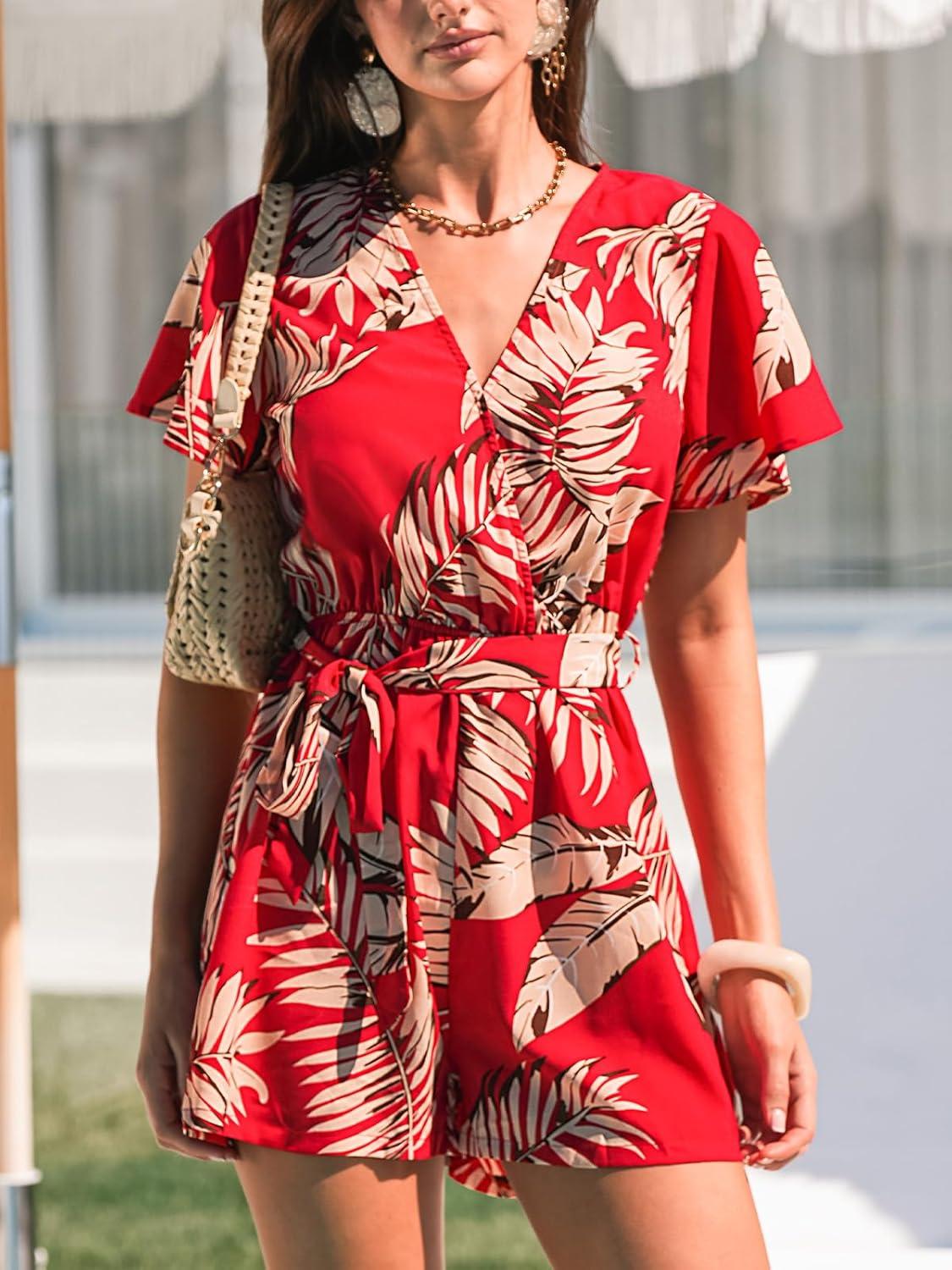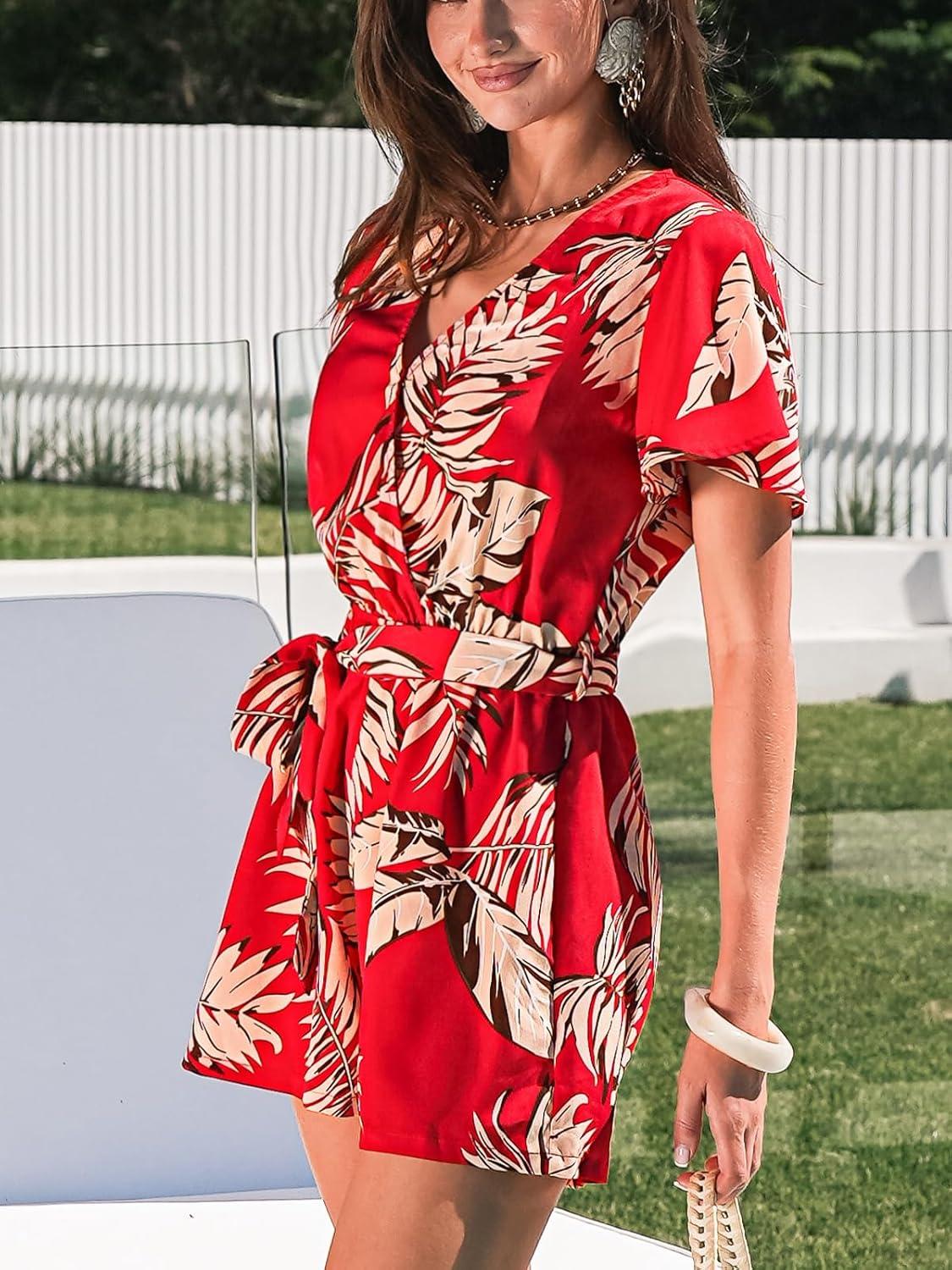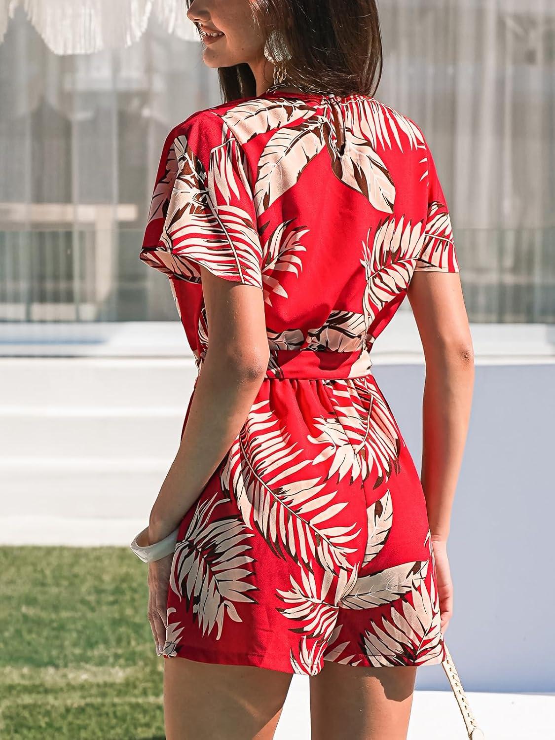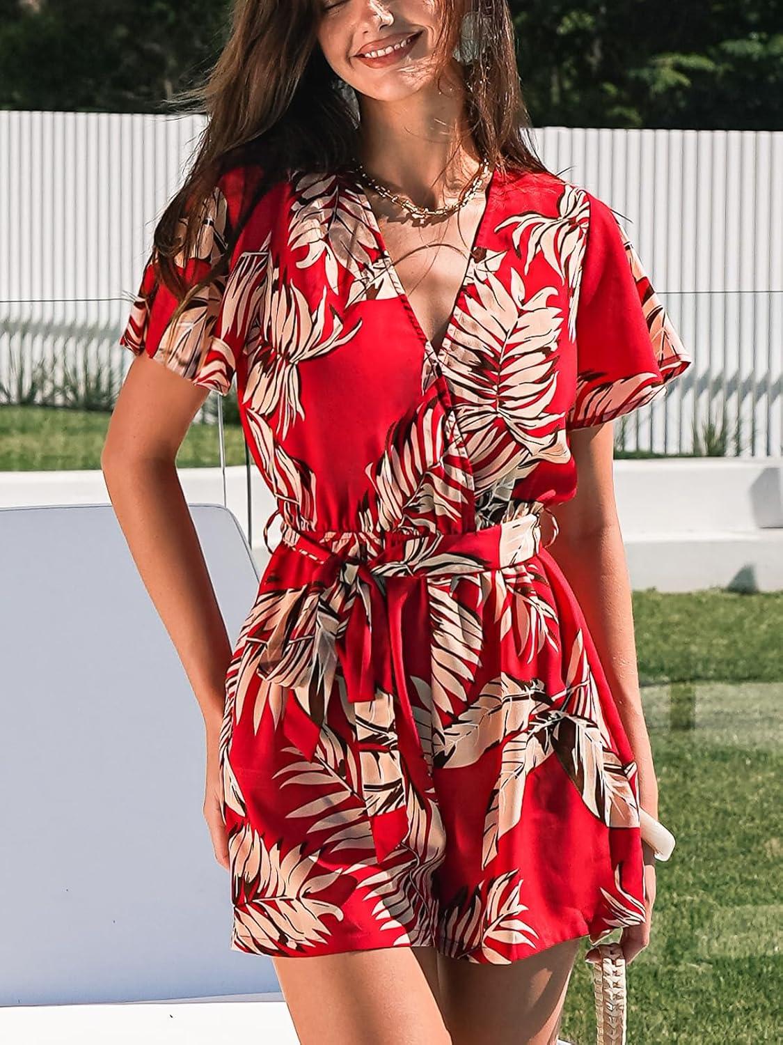 CUPSHE Women's Summer Wide Leg Rompers V Neck Short Sleeve Overall Jumpsuit Beach Vacation Outfit(Floral Red)