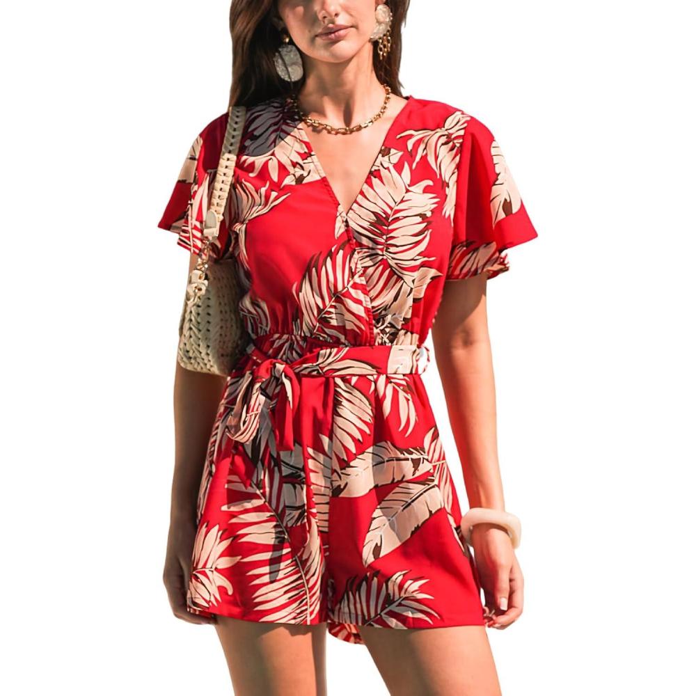 imageCUPSHE Womens Summer Wide Leg Rompers V Neck Short Sleeve Overall Jumpsuit Beach Vacation OutfitFloral Red