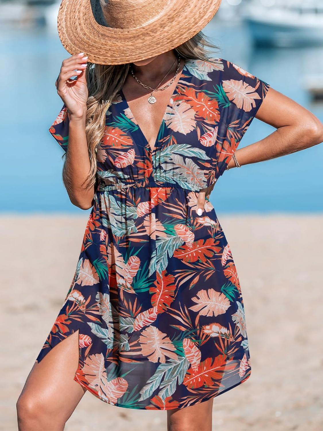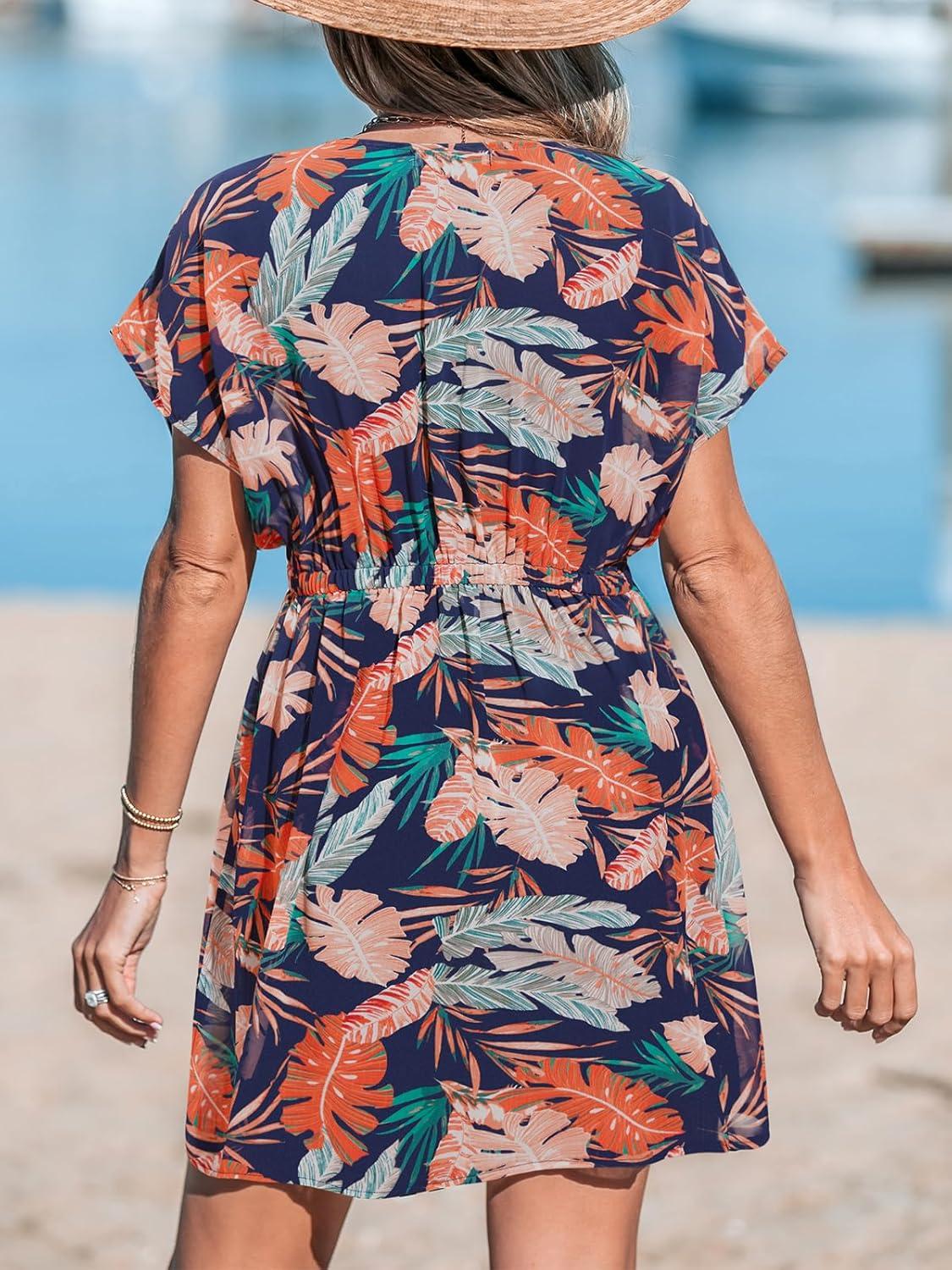 CUPSHE Women's Swimsuit Coverup Casual V Neck Beach Dress Short Sleeve Elastic Waist Swimwear Cover Ups 2025 Beachwear(Navy Leaf)