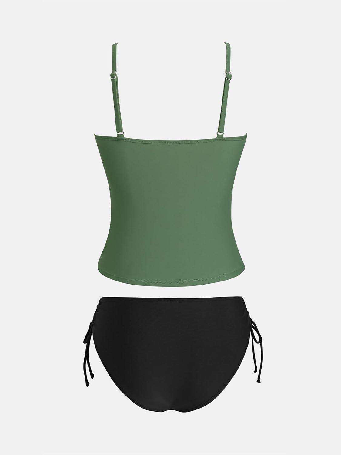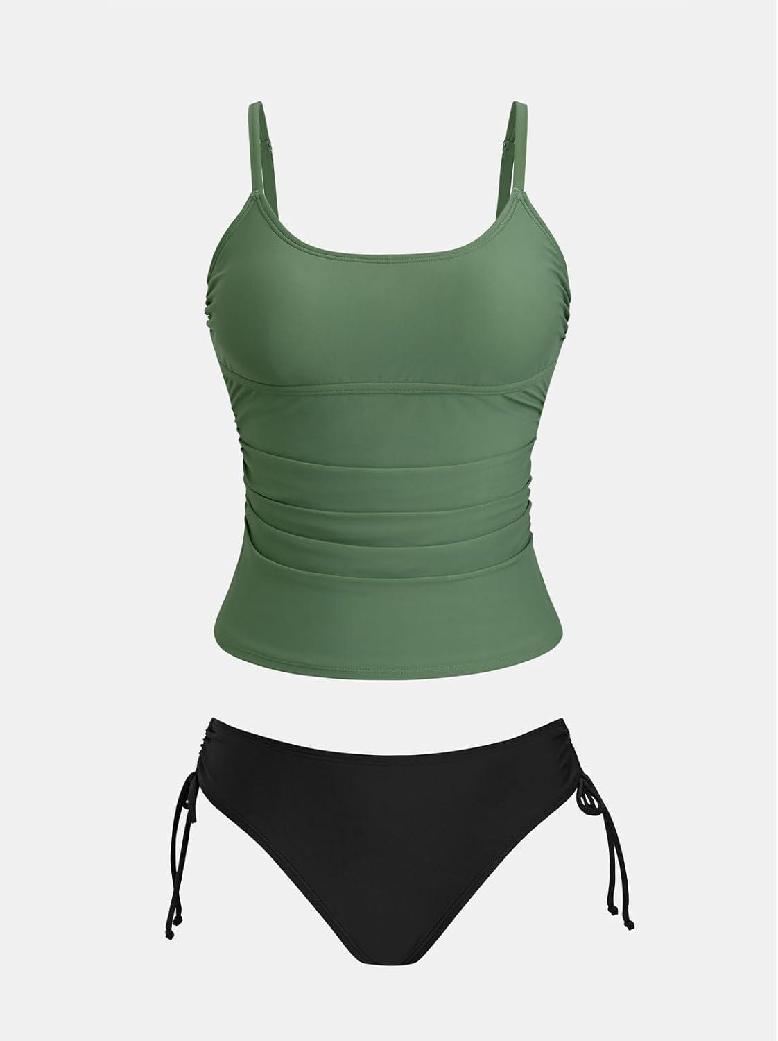 CUPSHE Women's Tankini Sets Two Piece Swimsuit Scoop Neck Ruched Adjustable Straps Drawstring Mid Rise(Dark Green/Black)