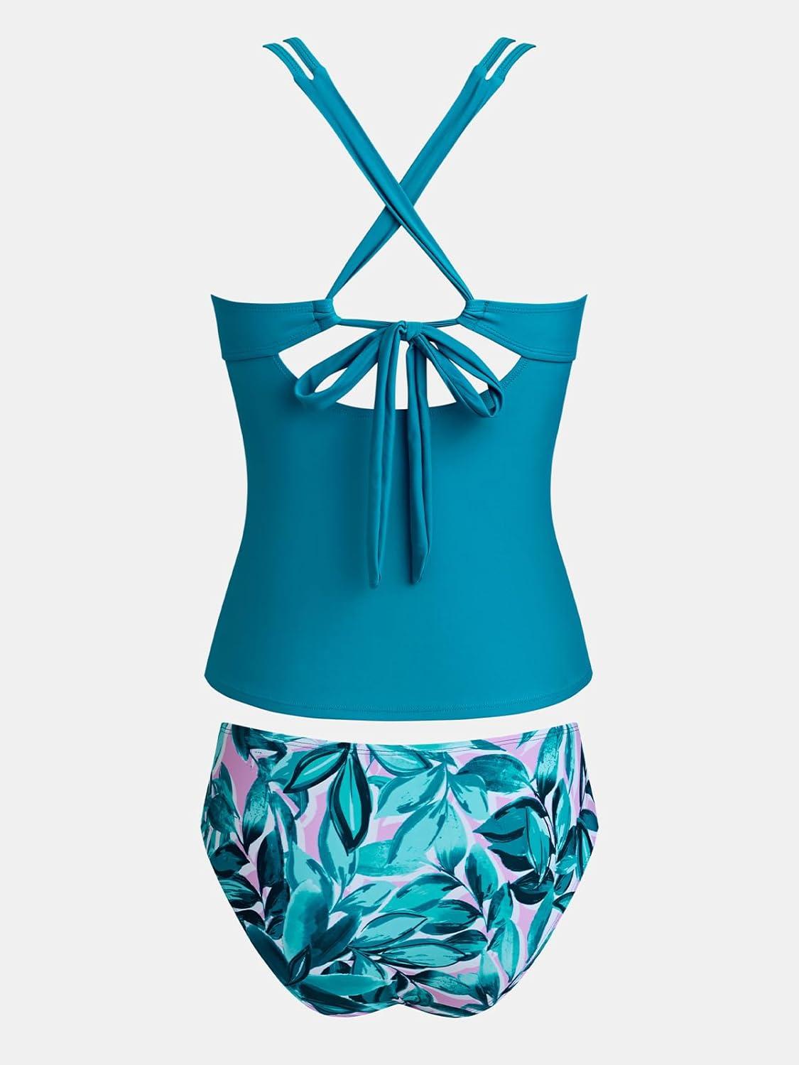 CUPSHE Women’s Tankini Sets Two Piece Swimsuit Scoop Neck V Cut Double Straps Self Tied Bathing Suit Ruched Tummy(Teal Blue/Floral)