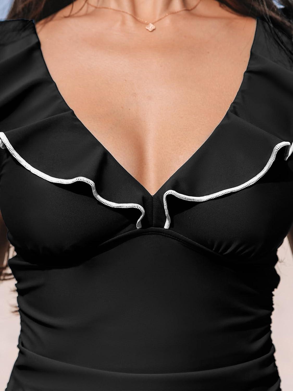 CUPSHE Women’s Tankini Sets Two Piece Swimsuit V Neck Ruffled Adjustable Straps Ruched (XS-4XL)(P-black)