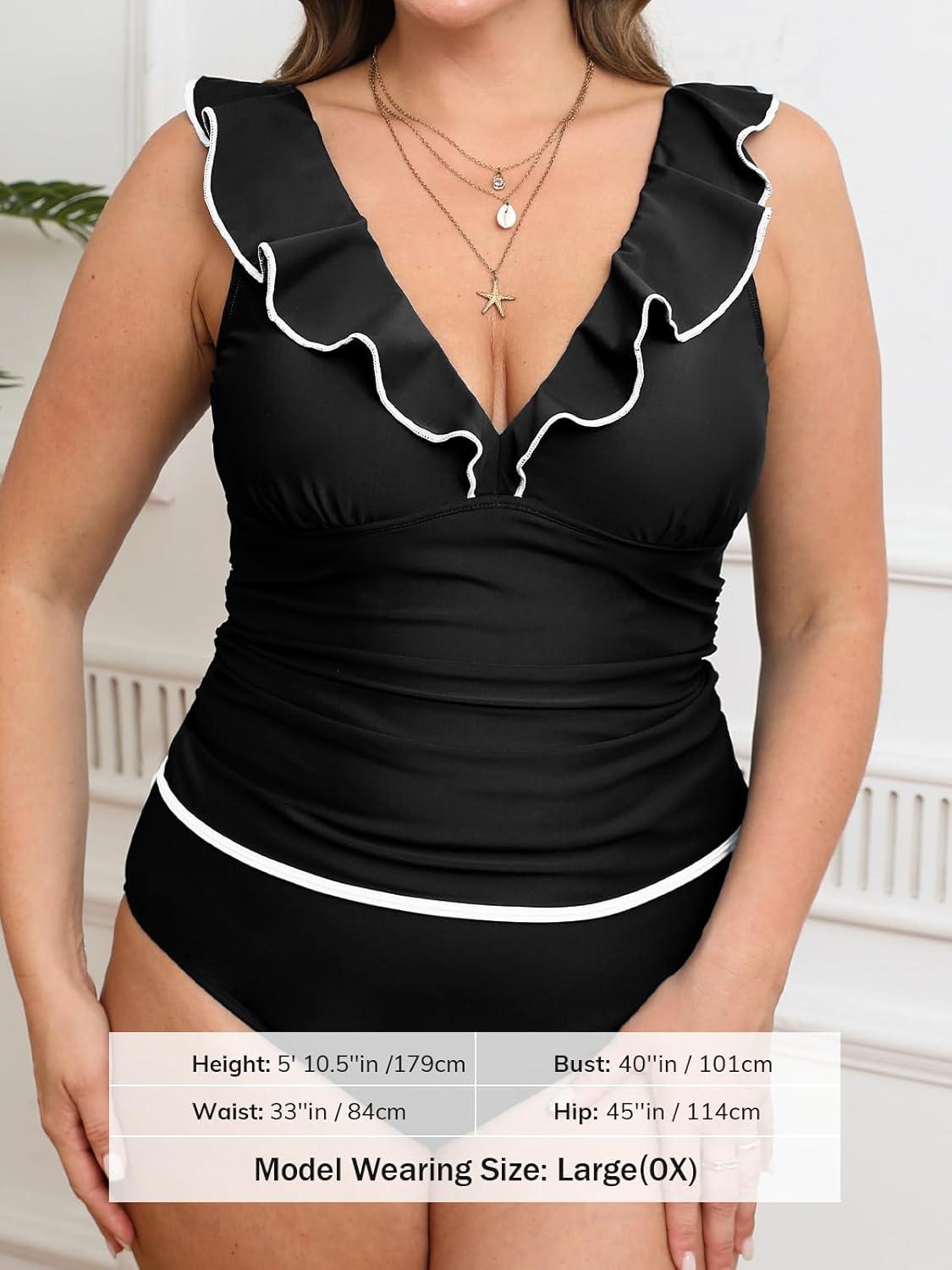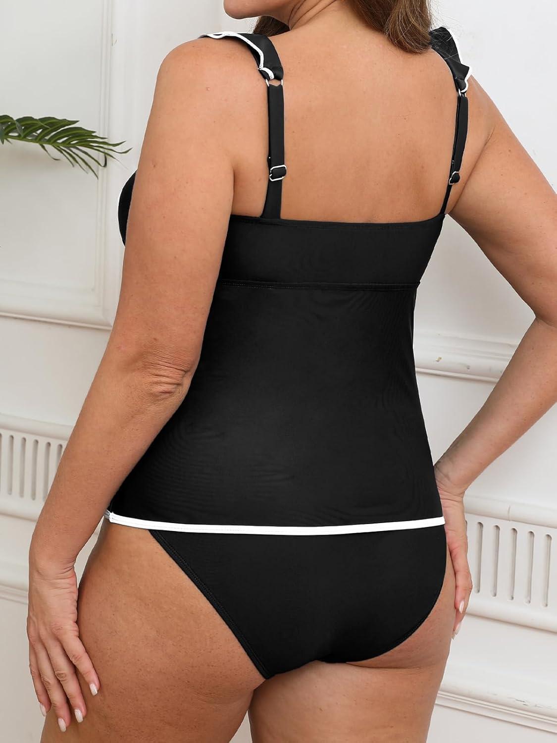 CUPSHE Women's Tankini Sets Two Piece Swimsuit V Neck Ruffled Adjustable Straps Ruched (XS-4XL)(P-black)