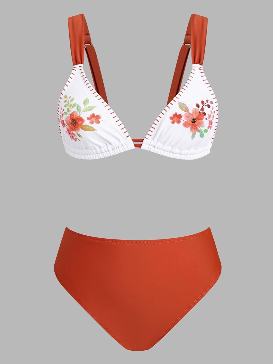 CUPSHE Women’s Two Piece Bikini Sets High Waisted V Neck Bathing Suits Stitching Back Self Tie Wide Adjustable Straps(Rust/Orange Floral)