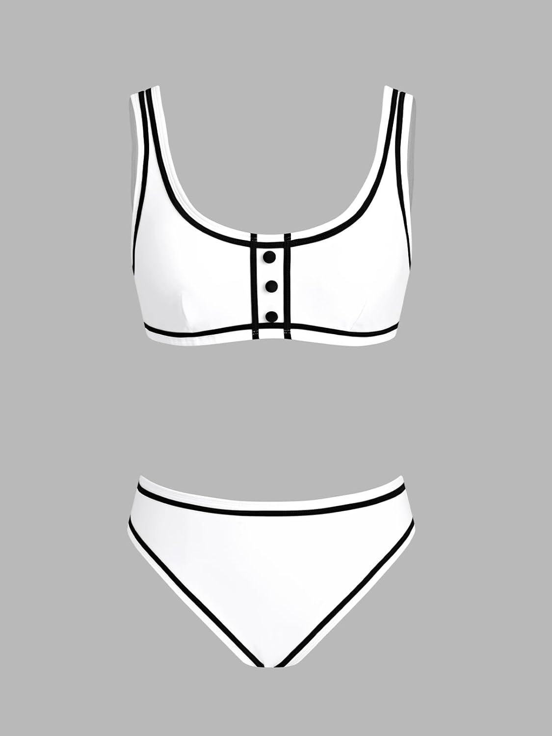 CUPSHE Women's Two Piece Bikini Sets Scoop Neck Bathing Suits Color Block Button Wide Straps Mide Rise Swimwear(White/Black)