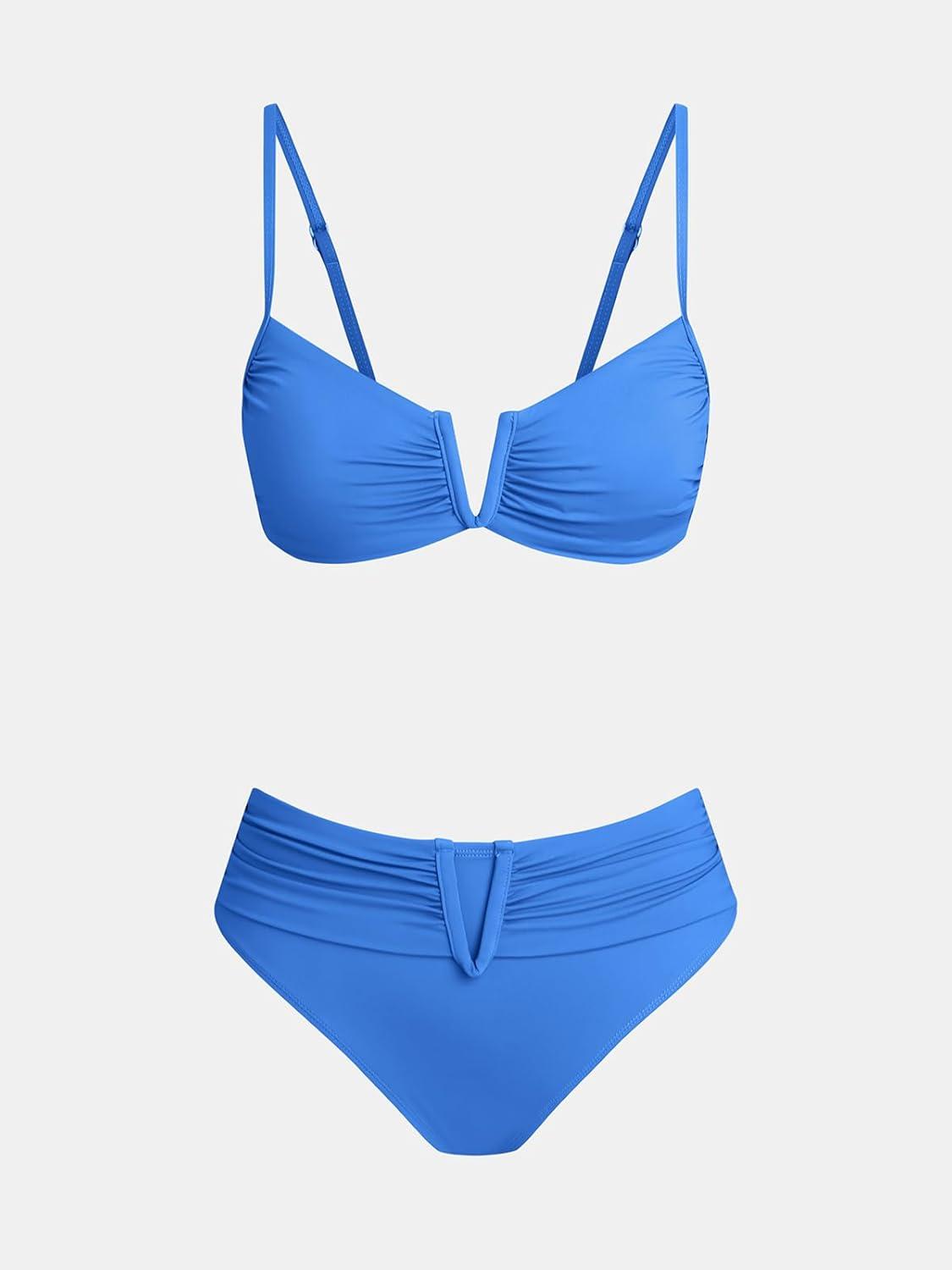 imageCUPSHE Womens Two Piece Bikini Sets Scoop Neck V Wire Bathing Suits Ruching Back Hook Adjustable StrapsDeep Blue
