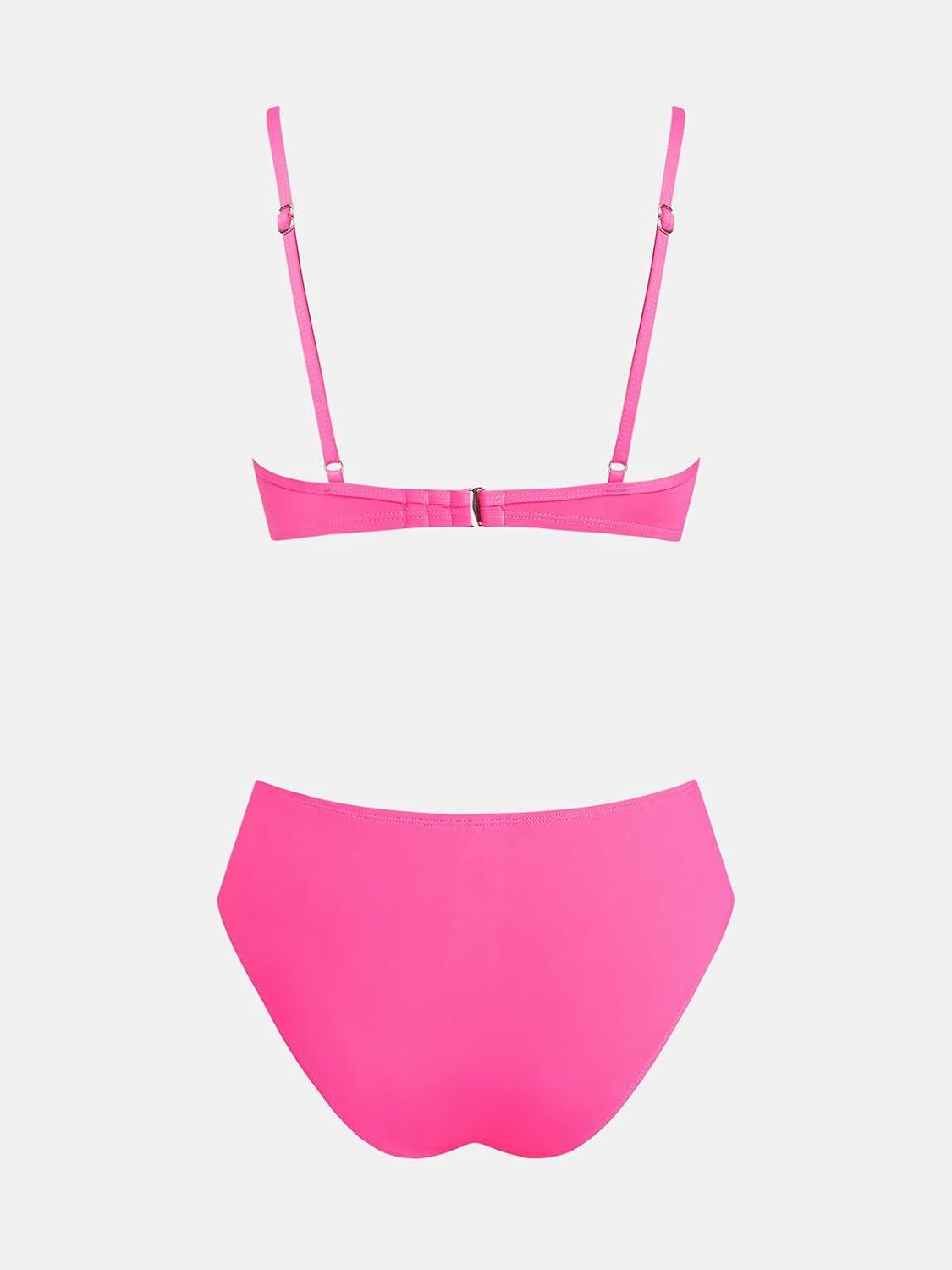 CUPSHE Women’s Two Piece Bikini Sets Scoop Neck V Wire Bathing Suits Ruching Back Hook Adjustable Straps(Hot Pink)