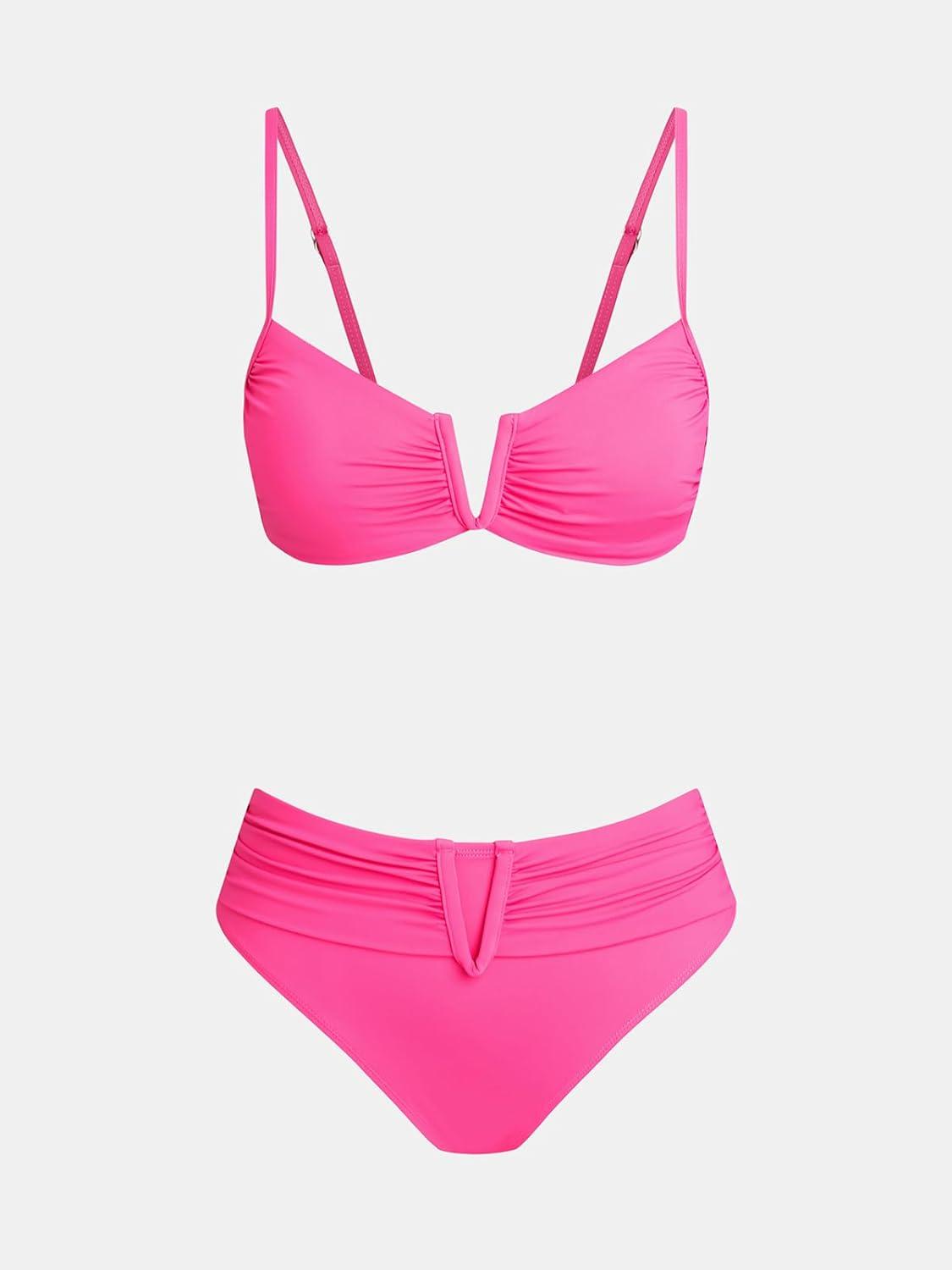 CUPSHE Women's Two Piece Bikini Sets Scoop Neck V Wire Bathing Suits Ruching Back Hook Adjustable Straps(Hot Pink)