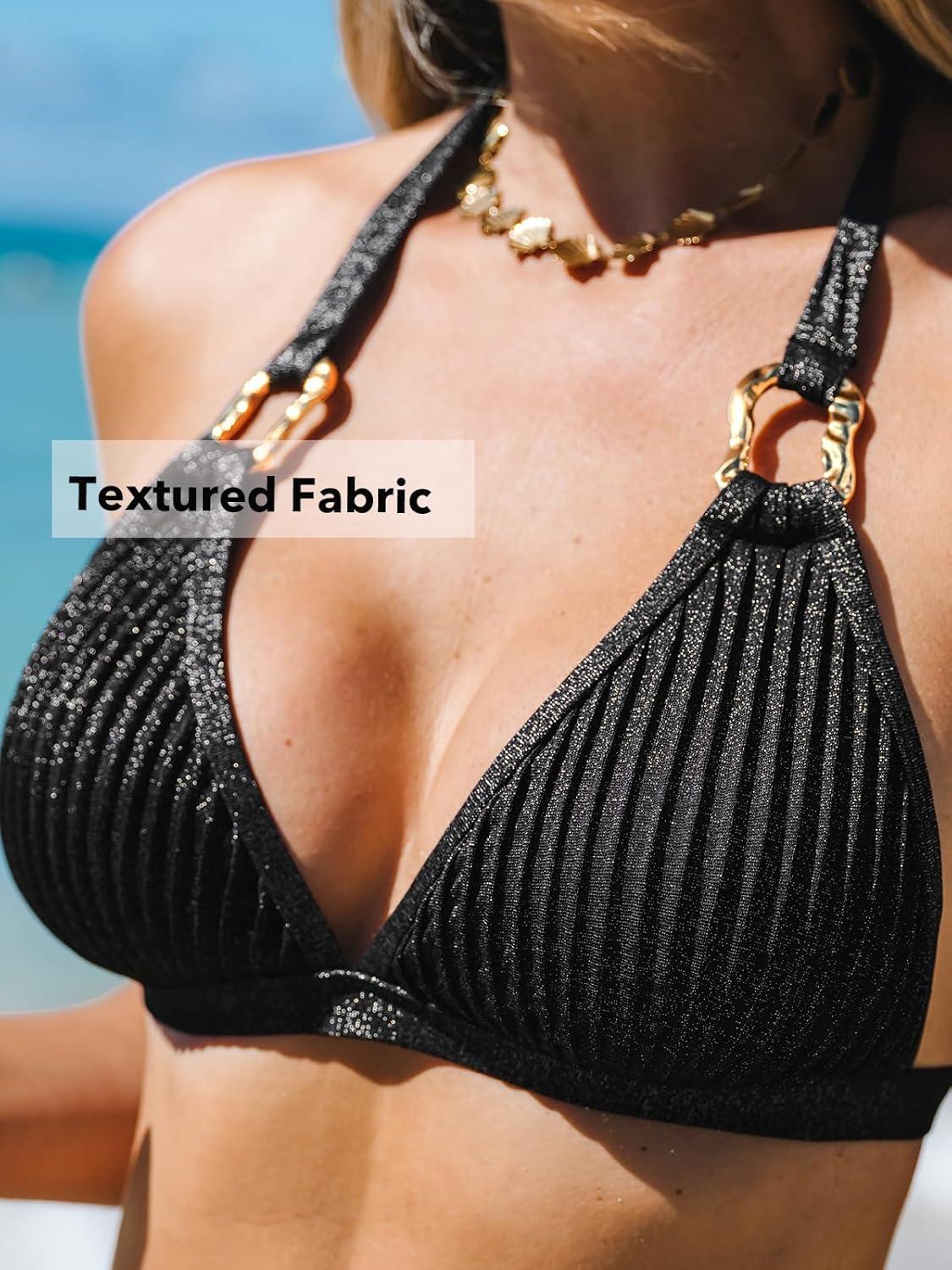 CUPSHE Women’s Two Piece Bikini Sets V Neck Bathing Suits Textured Halter Side Shirred Back Hook Adjustable Straps(Black)