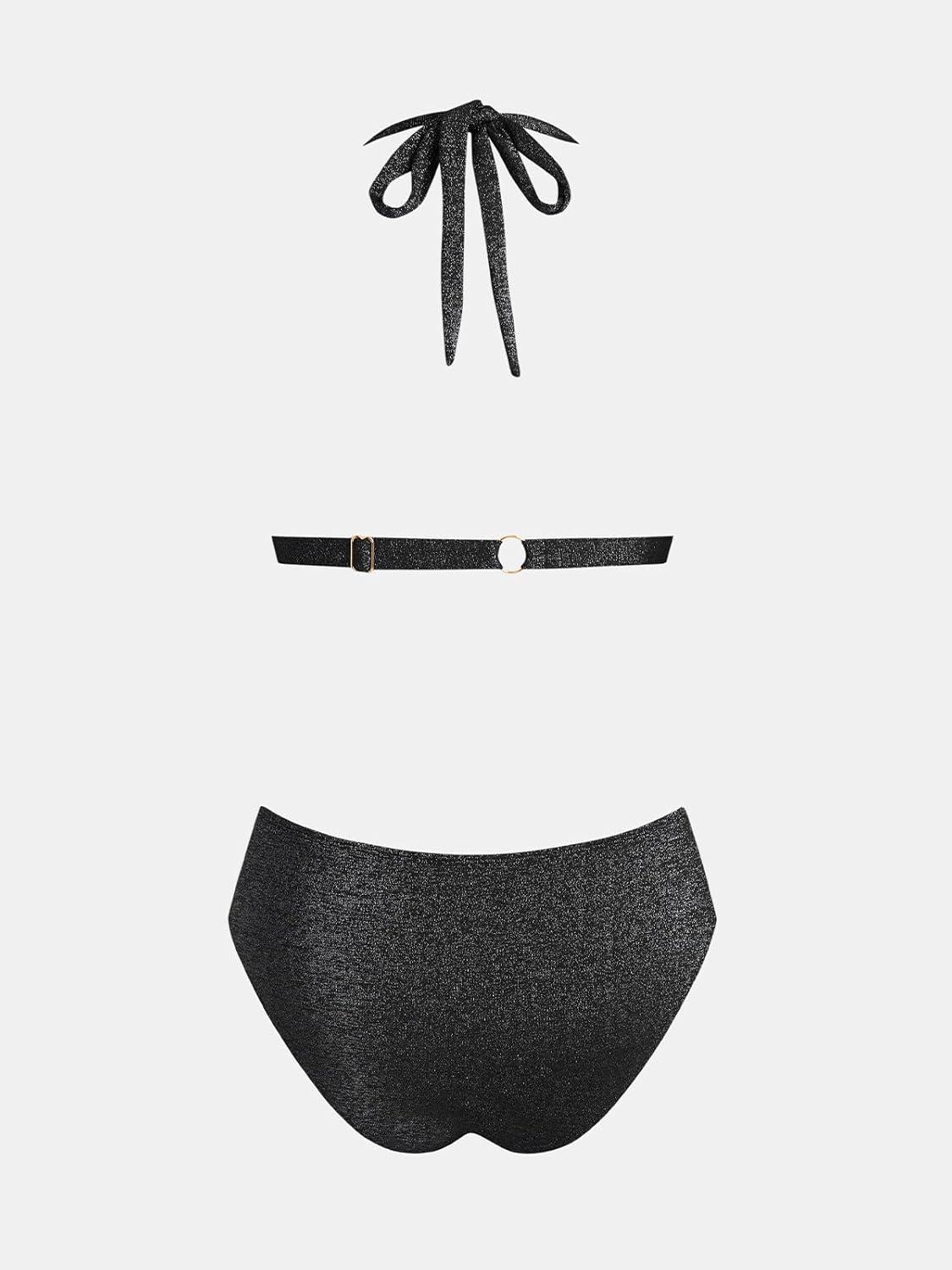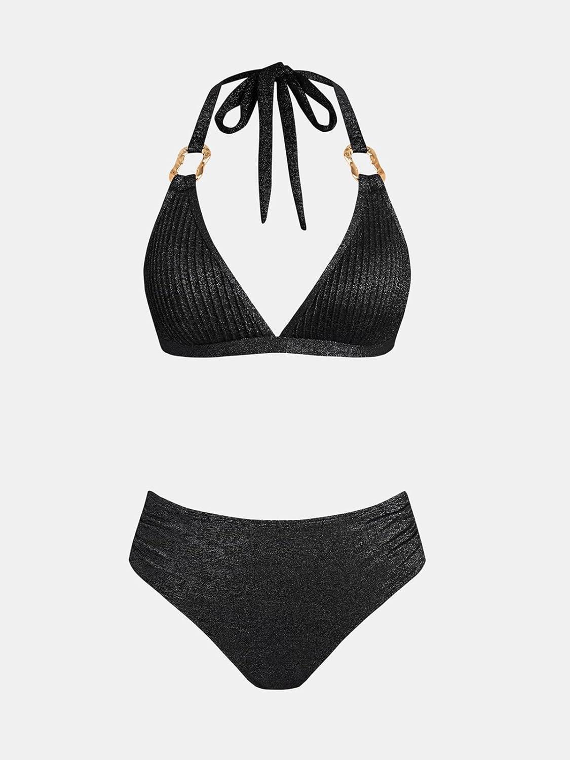 CUPSHE Women's Two Piece Bikini Sets V Neck Bathing Suits Textured Halter Side Shirred Back Hook Adjustable Straps(Black)